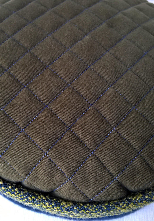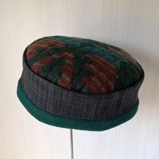 Green wool and blue fleece pillbox hat
