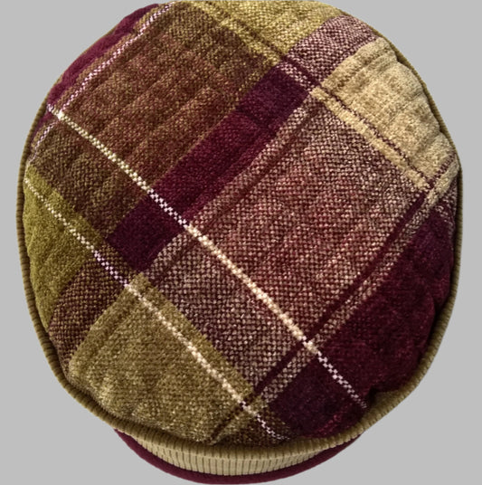 Check Chenille Pillbox Hat in olive green & burgundy fleece lining