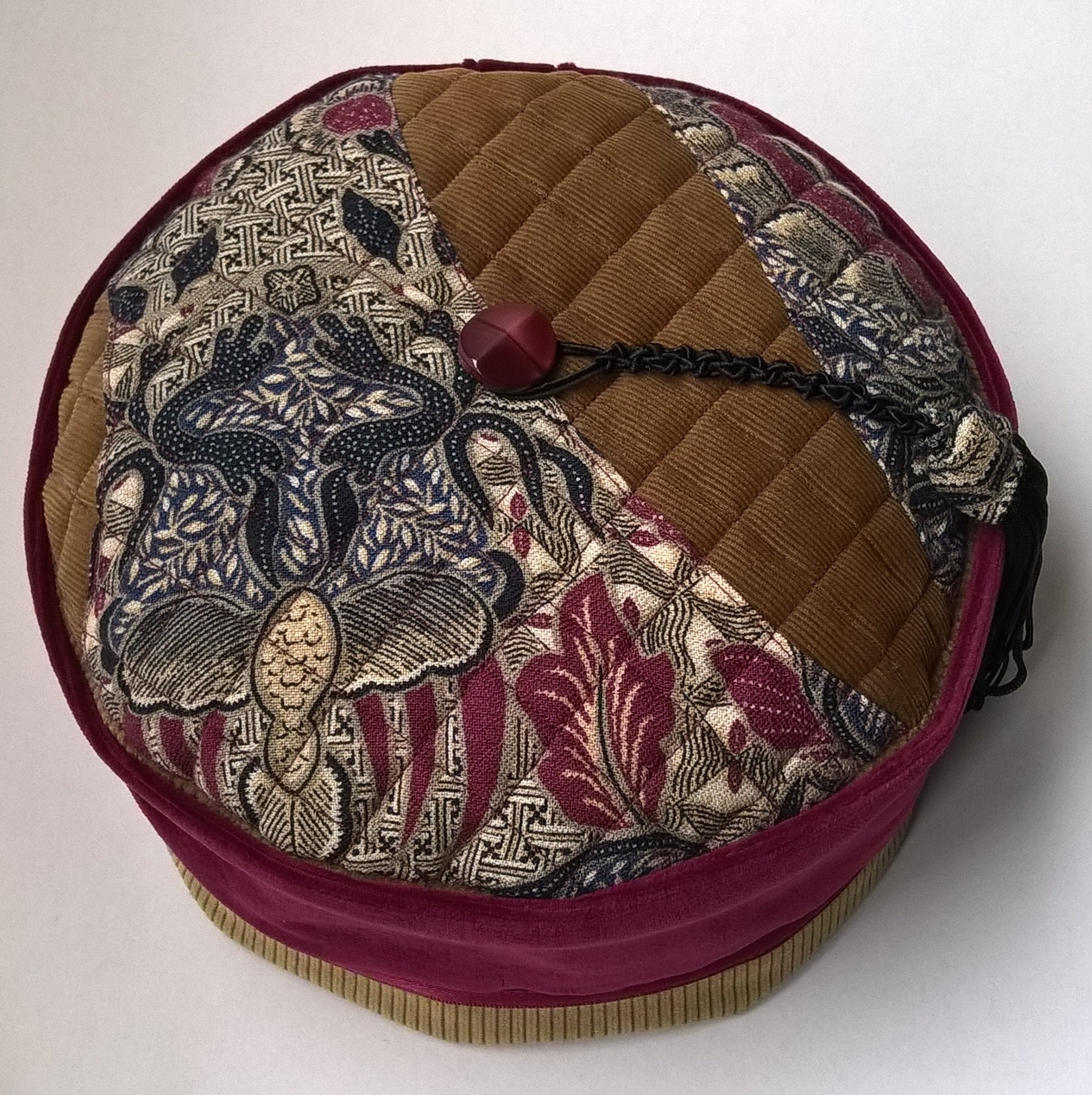 This handmade hat has a distinctive tip of brown corduroy with an appliqued design using paisley vintage fabric off cuts. A deep band of luscious vintage burgundy cotton velvet on the crown is edged with burgundy satin ribbon and highlighted by a band of olive brown cotton corduroy. The corduroy carries through to the inside of the hat to form part of the lining along with burgundy satin.