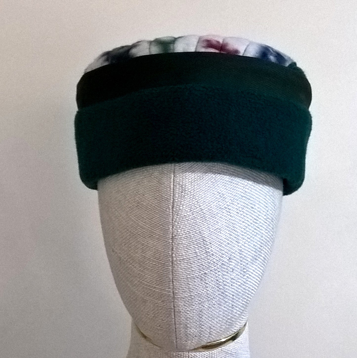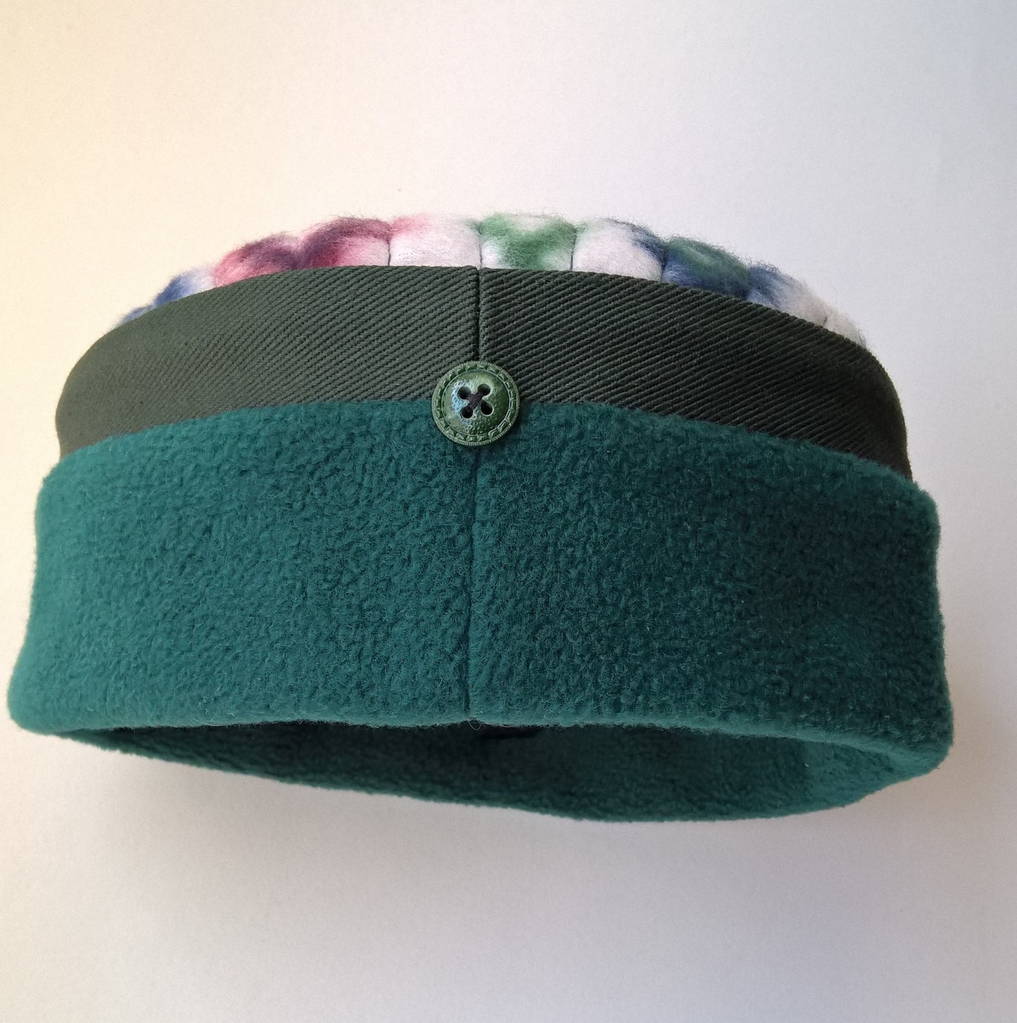 Wonderfully vibrant this pillbox style cap is handmade in soft cosy fleece. It has a tribal patterned multi coloured fleece tip, with a cosy forest green fleece crown.
