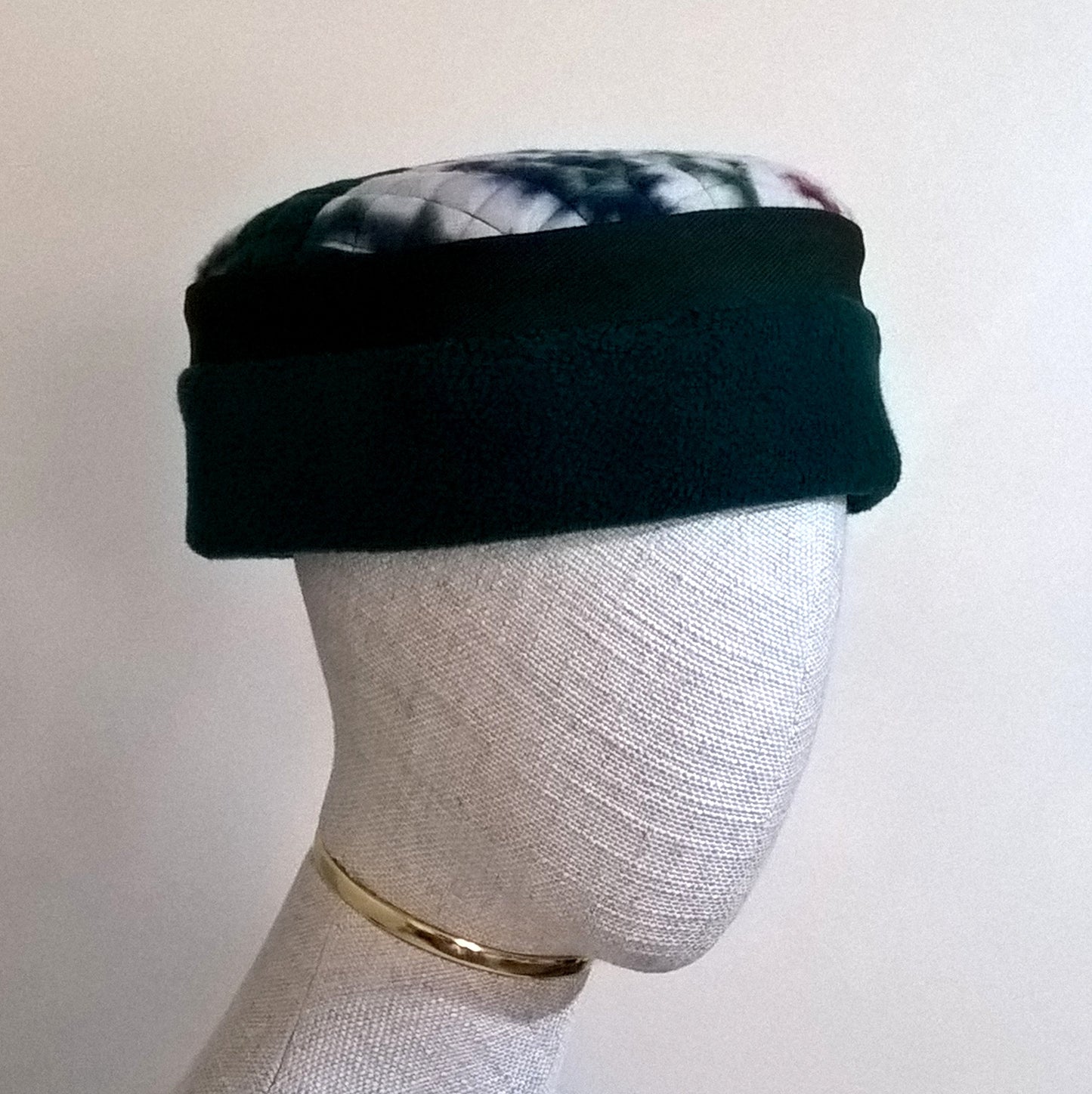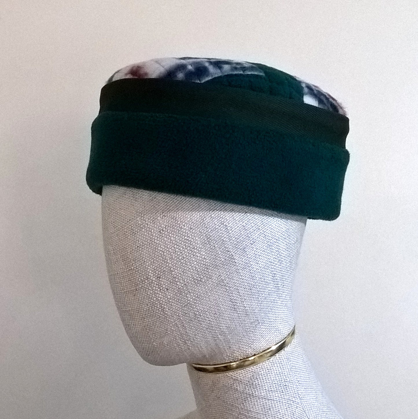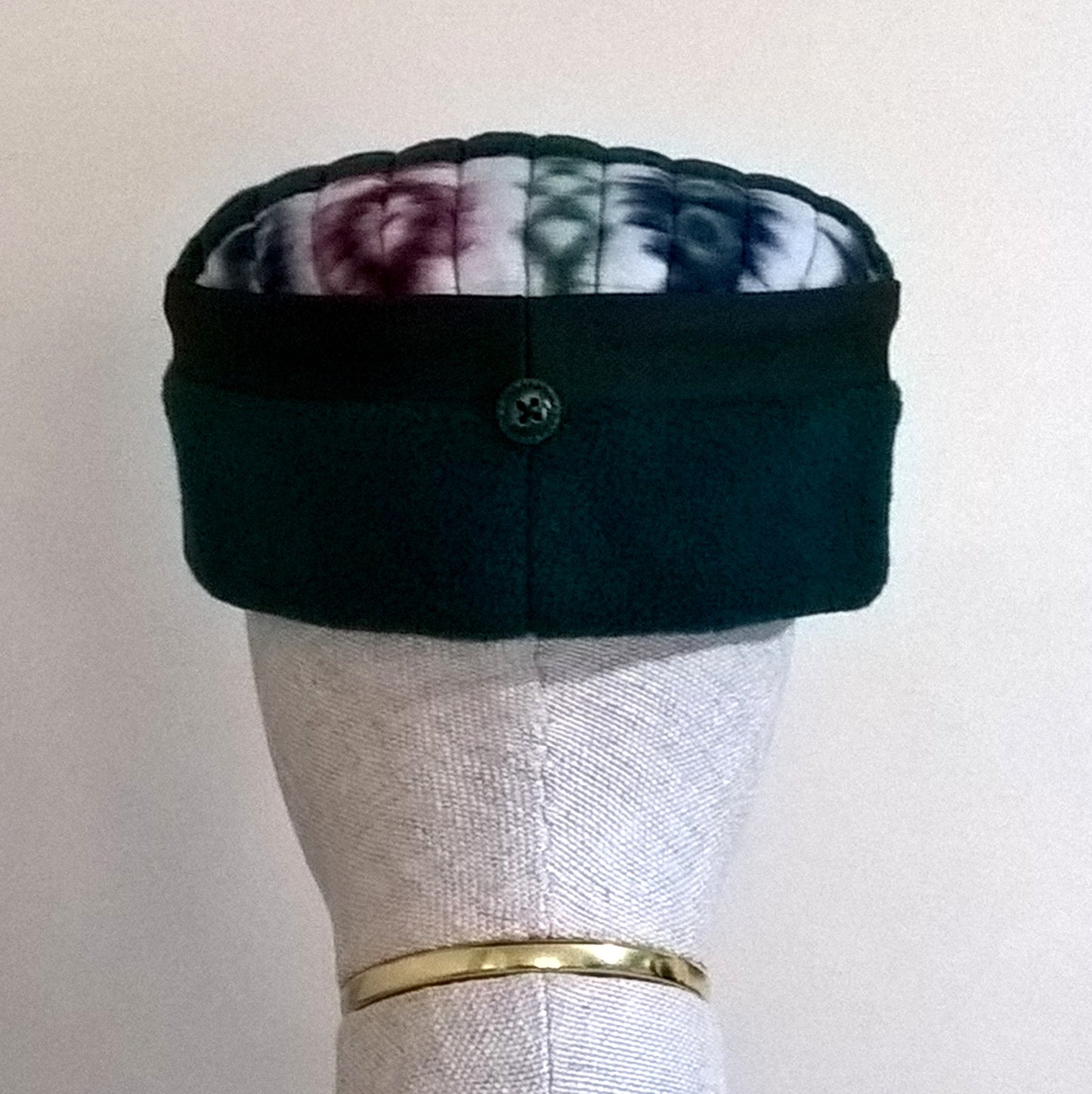 The beautiful patterned tip is a patchwork design, quilted to give the hat structure. The crown has a sophisticated edging of green twill, and a button attached to the centre back adds designer detail. The inside is hand finished with ecru ribbed fleece lining to compliment the exterior, and for extra cosiness.