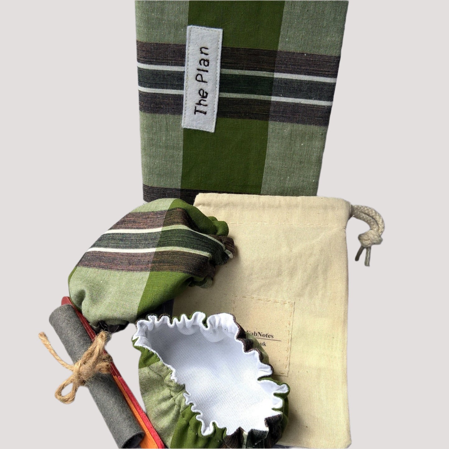 An A6 lined notebook with a smart stylish jacket, in green check cotton fabric, finished with an embroidered felt label "The Plan", and lined with simple cotton jersey.