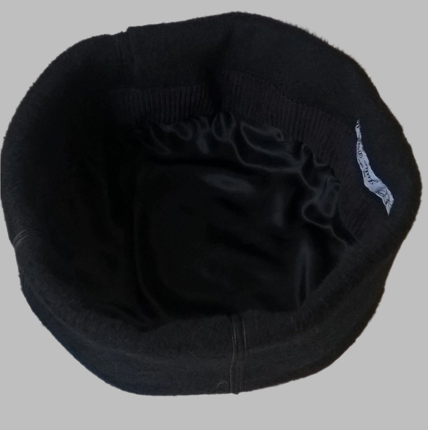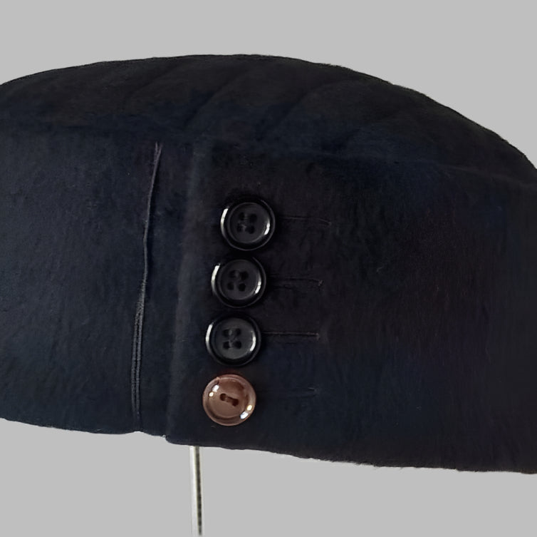 The beautiful black cashmere fabric is repurposed from a preloved coat and is 90% cashmere with 10% polyamide. Button detail from the cuff has been used on the crown, along with satin braid, with one of the original buttons replaced with a vibrant brown for a subtle pop of unexpected colour.