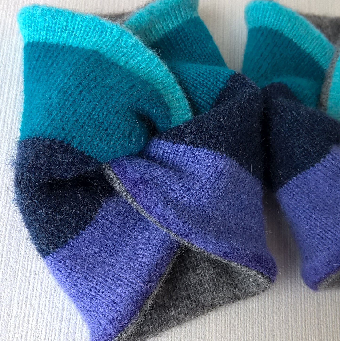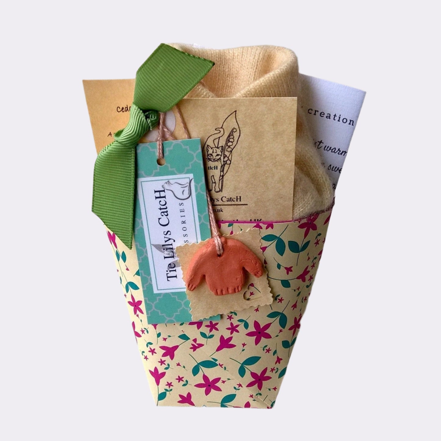 The wrist warmers come beautifully packaged within a traditional "day of the dead" origami festival cup in various colourful patterned and plain paper, to honour and celebrate the sweater that was. Included is a cedar wood heart to help keep your cashmere safe, and a small clay sweater as a reminder of their previous life.
