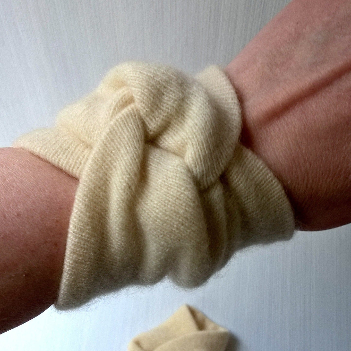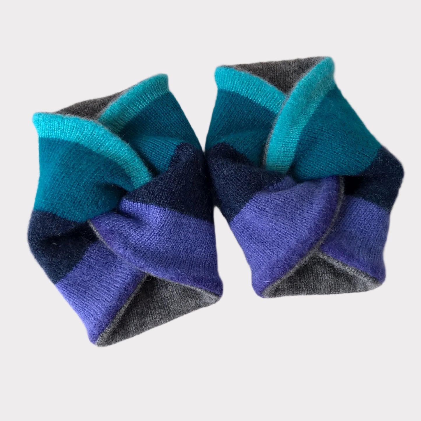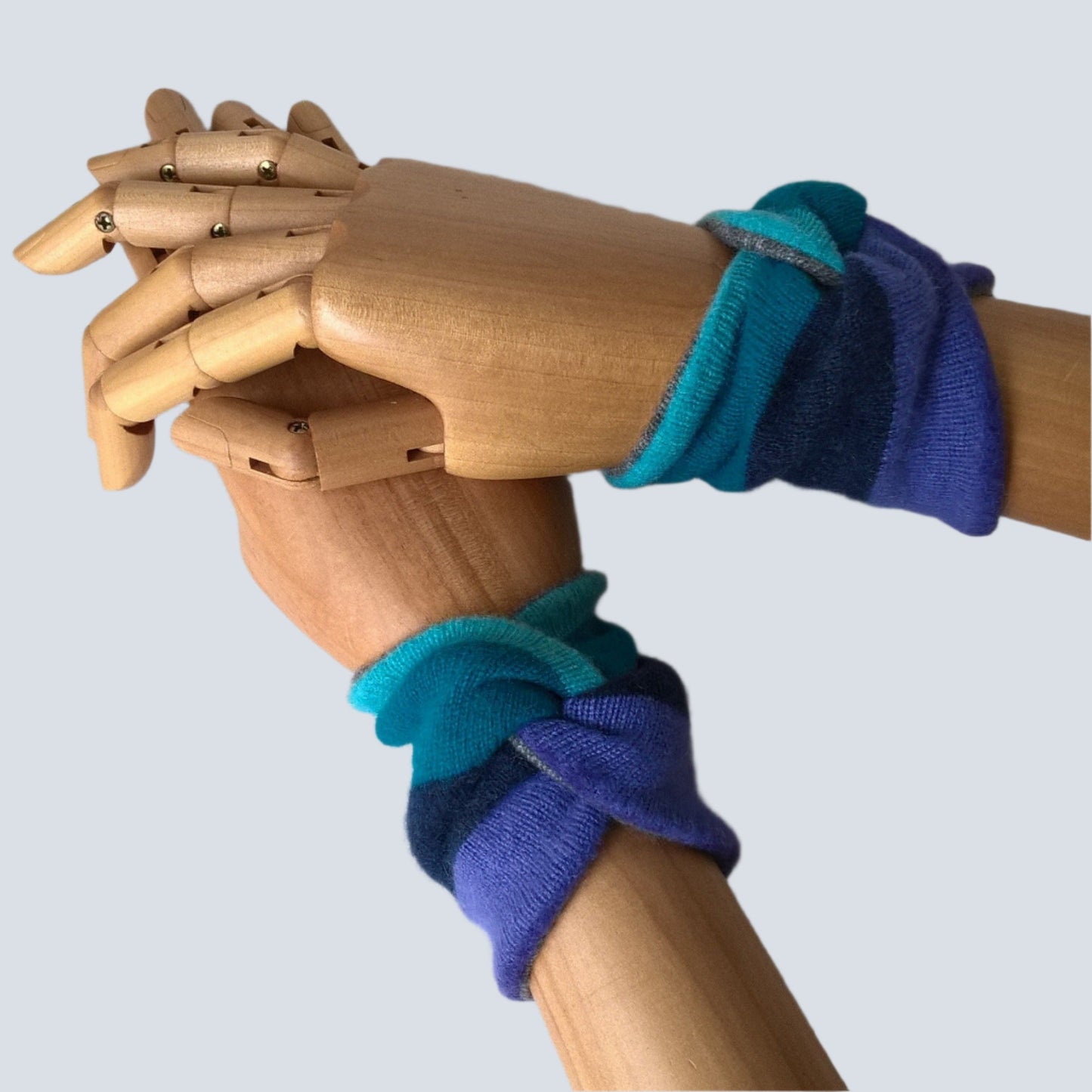 Crafted from pre-loved cashmere sweaters, these luxurious wrist warmers have a double layer of fine cashmere for premium insulation. The snug wrist knot and shorter style is practical for doing tasks. Perfect for a pop of colour and to keep cozy.