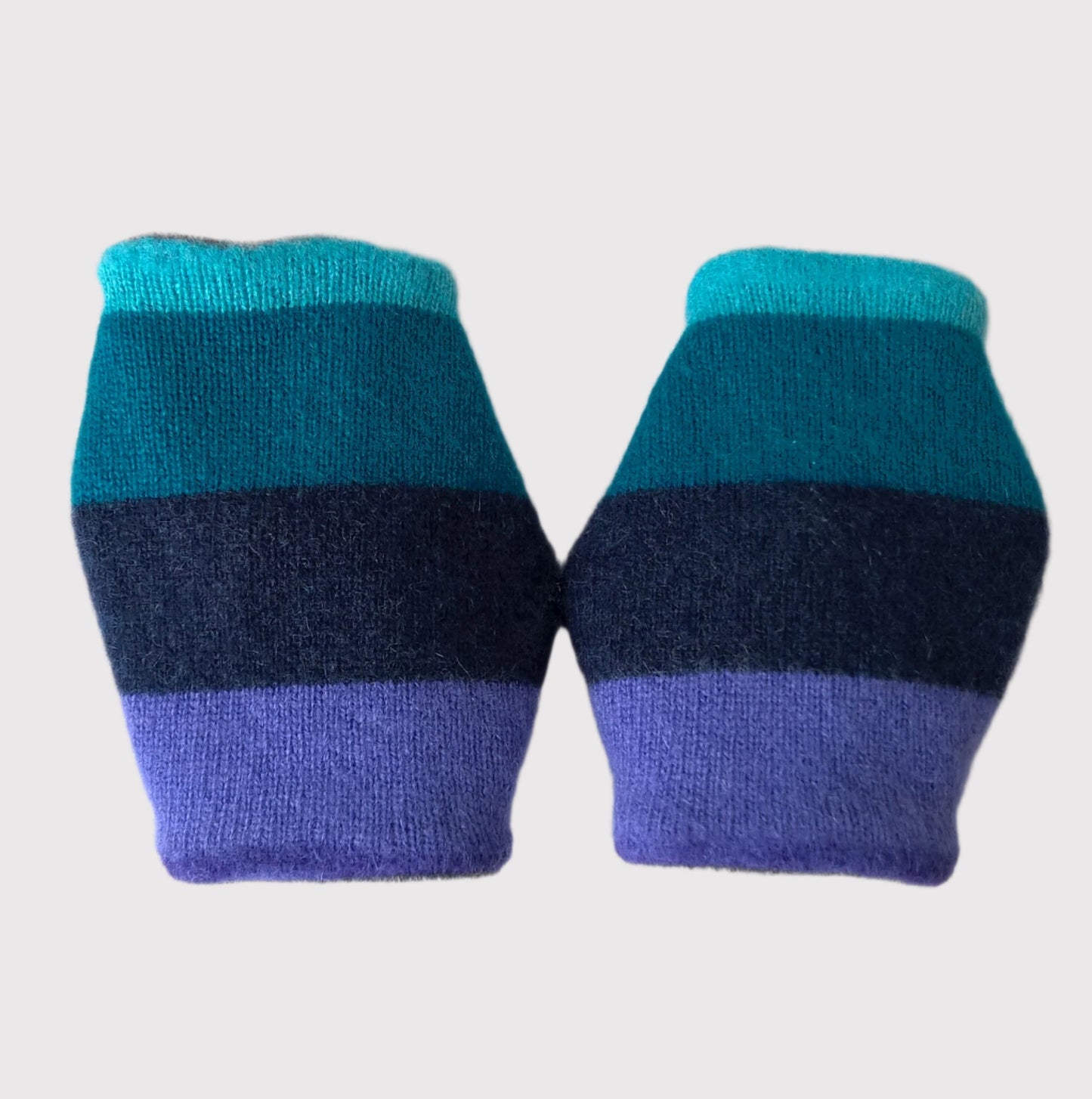 Stay warm and stylish wearing these pure cashmere wrist warmers in vibrant green and purple stripe lined with grey.