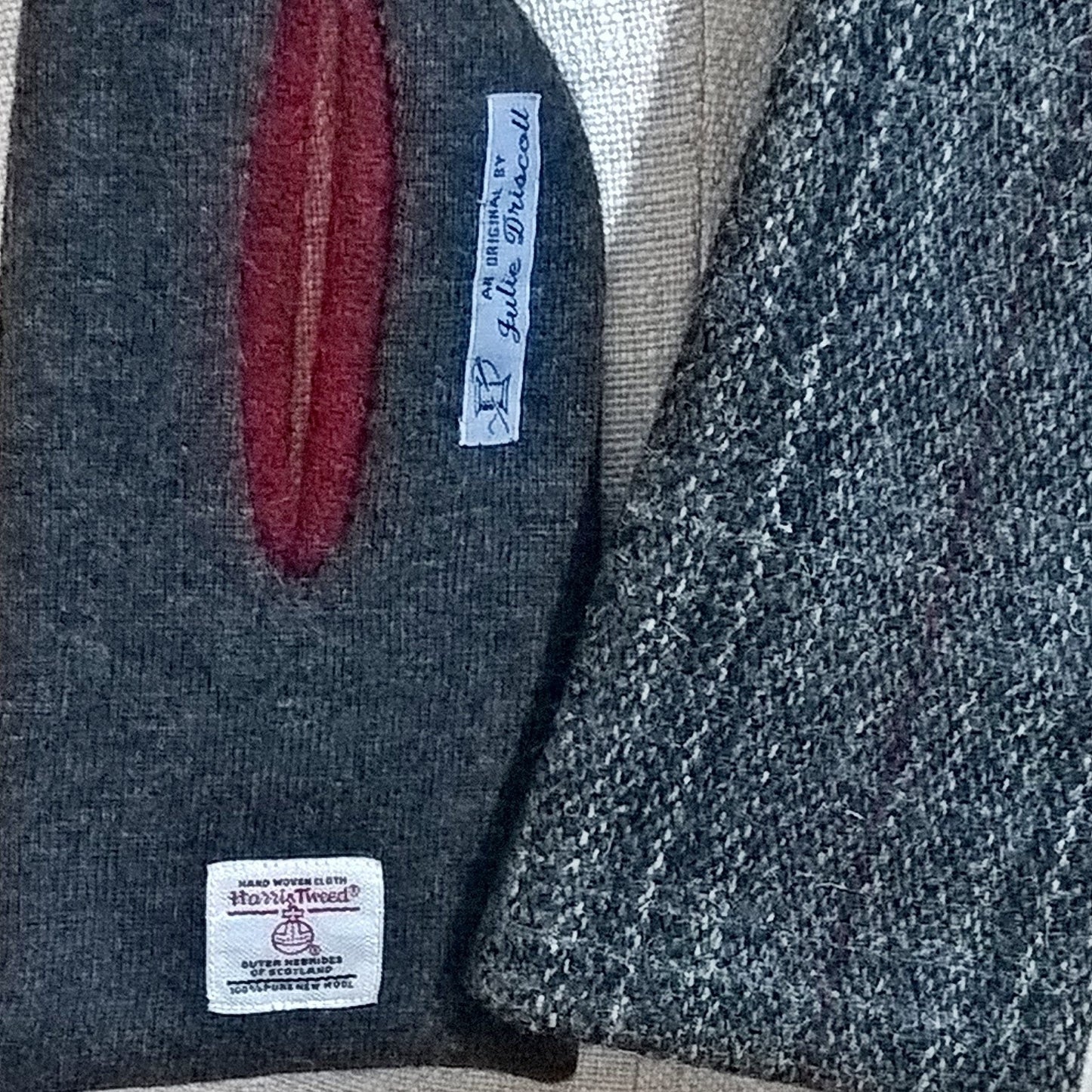 The short cravat style is handmade in iconic Harris Tweed, grey check with a hint of deep red, and lined with grey knit of wool/ cashmere blend for design and comfort. The beautifully soft knitted lining is up-cycled from a pre-loved cardigan and has a small pocket.
