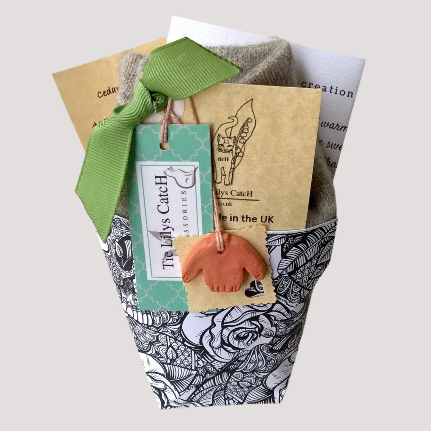 The wrist warmers come beautifully packaged within a traditional "day of the dead" origami festival cup in various patterned and plain paper, to honour and celebrate the sweater that was. Included is a cedar wood heart, to help guard against moths, and a small clay sweater as a reminder of their previous life.
