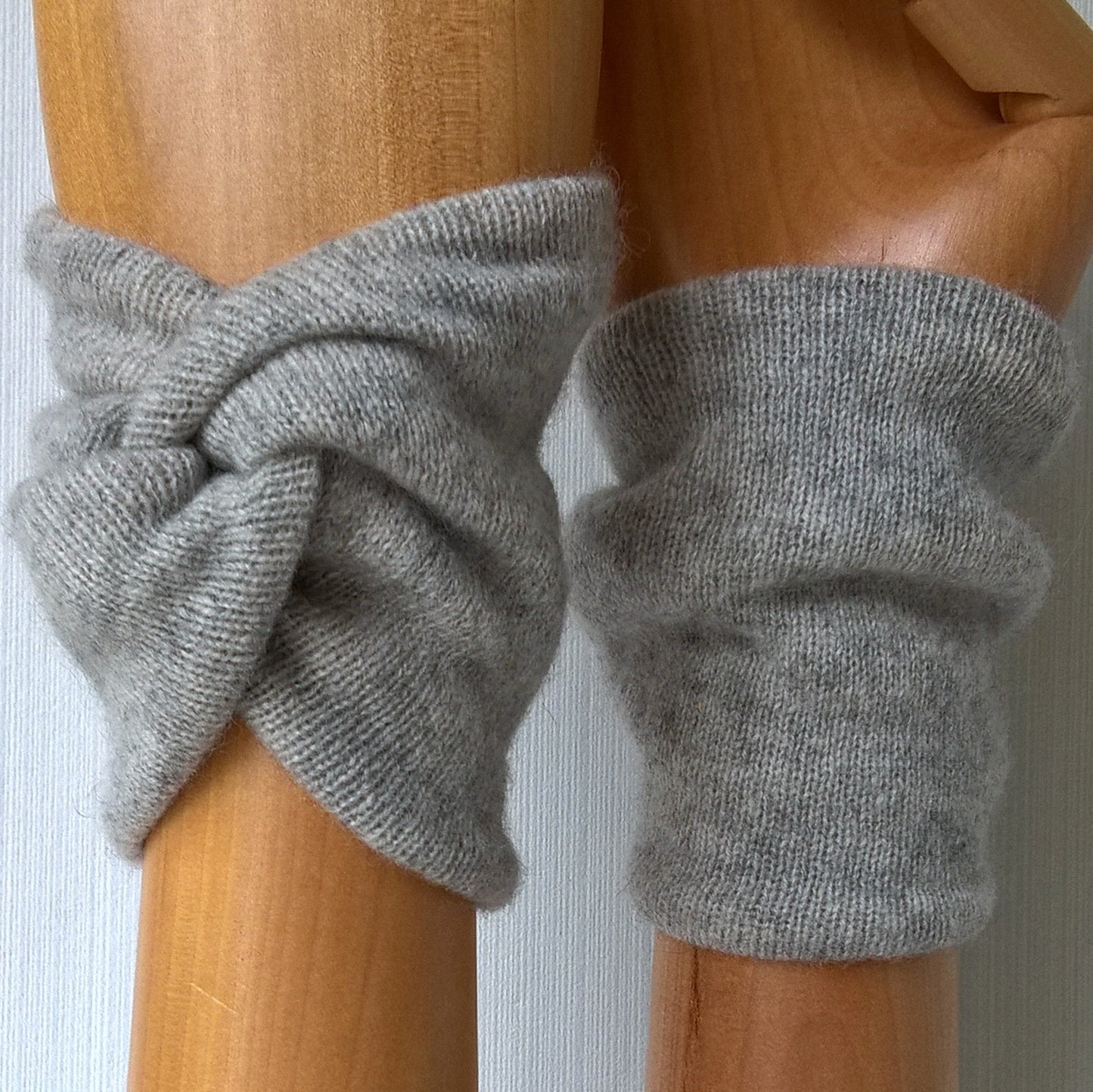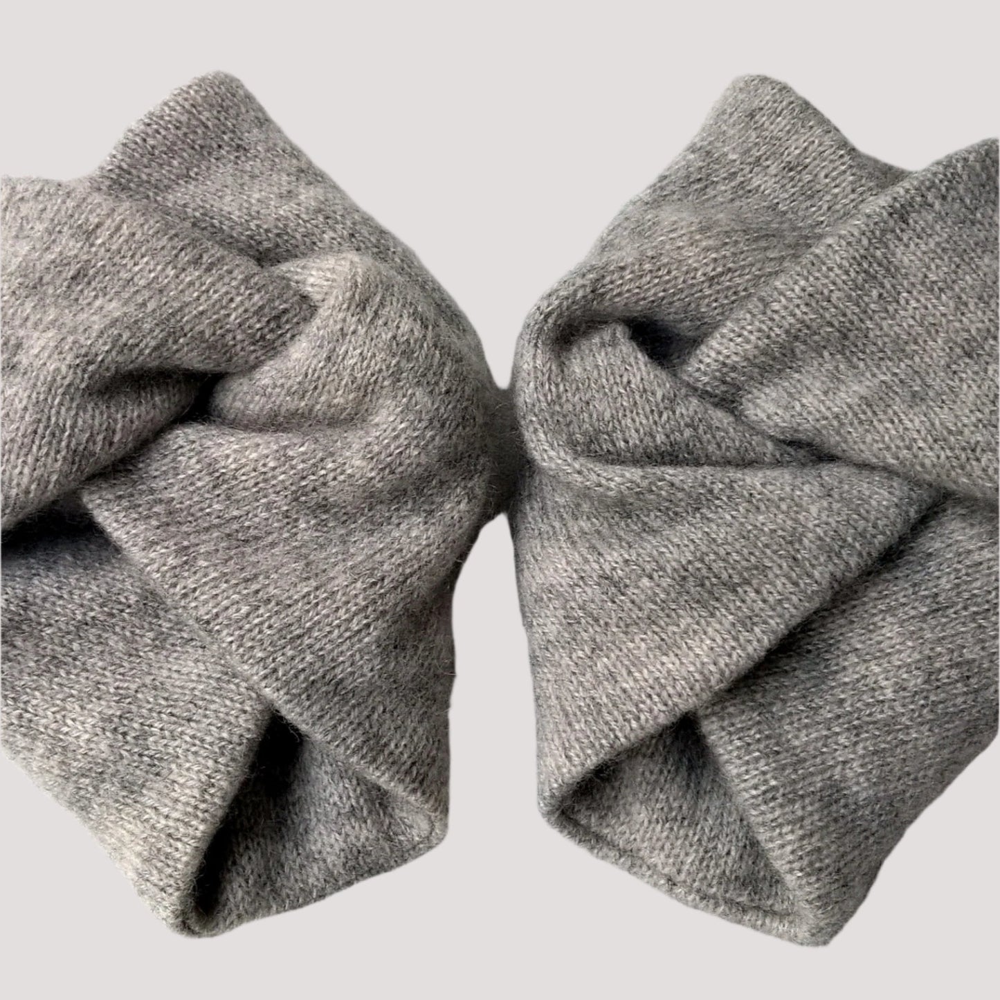 Handmade from pre-loved cashmere sweaters, they feature a double layer of cashmere for extra warmth and a snug wrist knot design for comfortable and practical wear. The shorter length means they can be worn without getting in the way while performing daily tasks. Just slip them on and forget all about them!