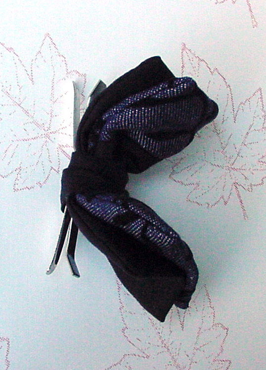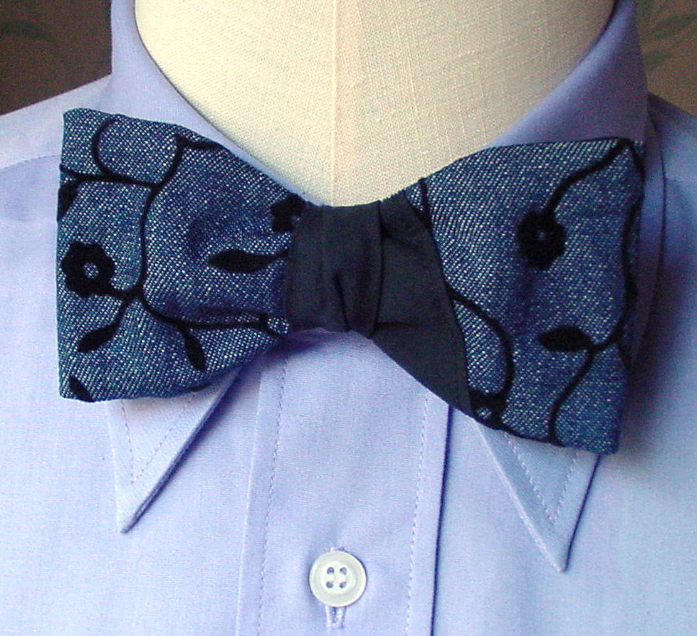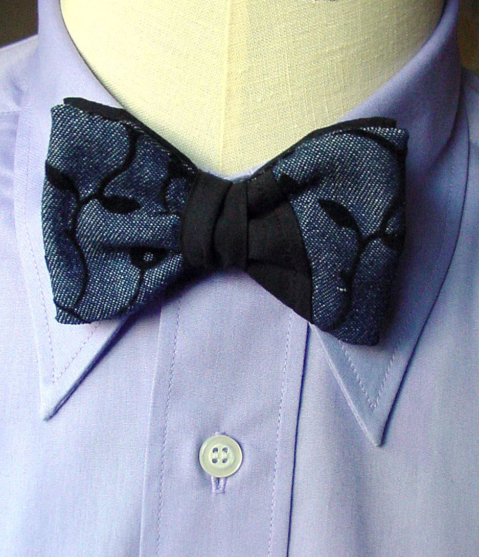Materials: flock denim, black cotton poplin, facing, metal bow tie clip,