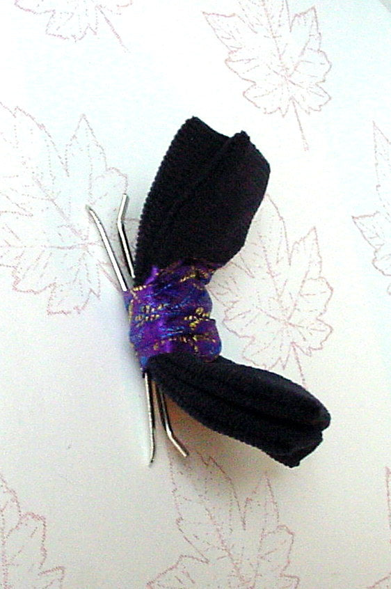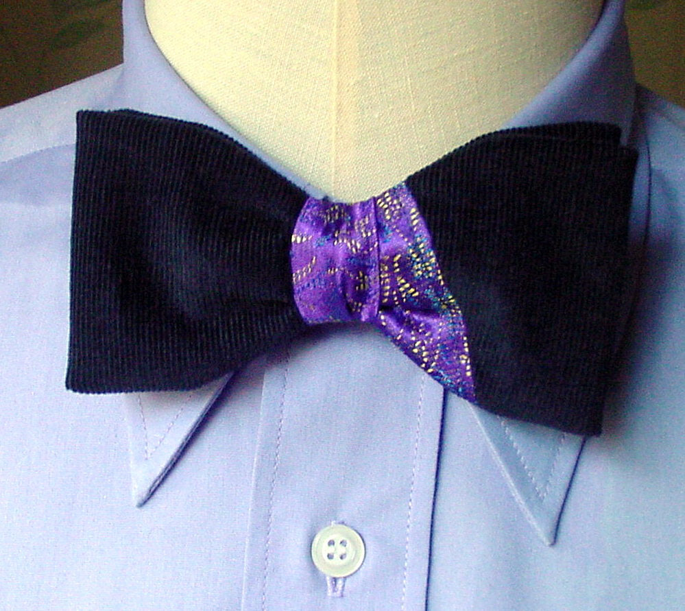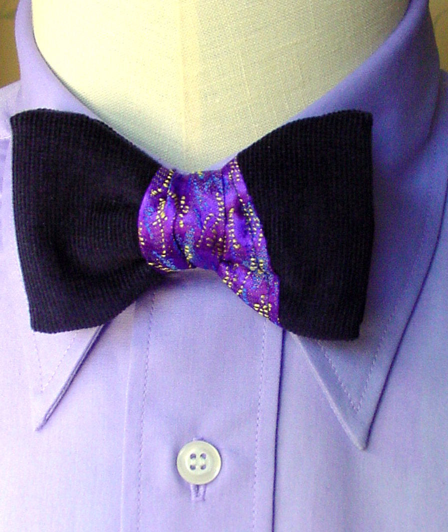 A unique bow tie handmade in soft navy corduroy and stunning orchid purple floral satin. The asymmetrical design is eye catching, while the unusual mix of textures adds sophistication. The clip on style attaches on to a shirt collar for easy wear, and is perfect for anyone who dislikes the feel of a neck strap.