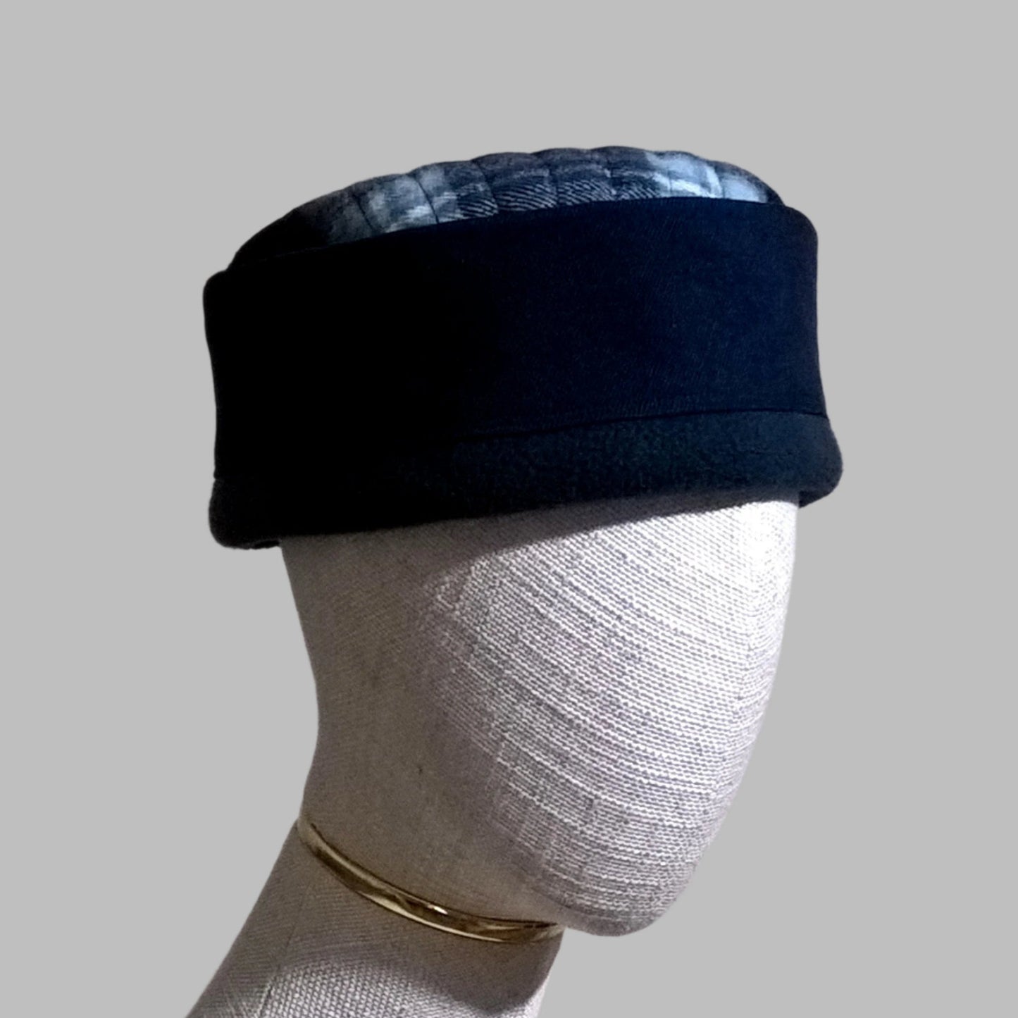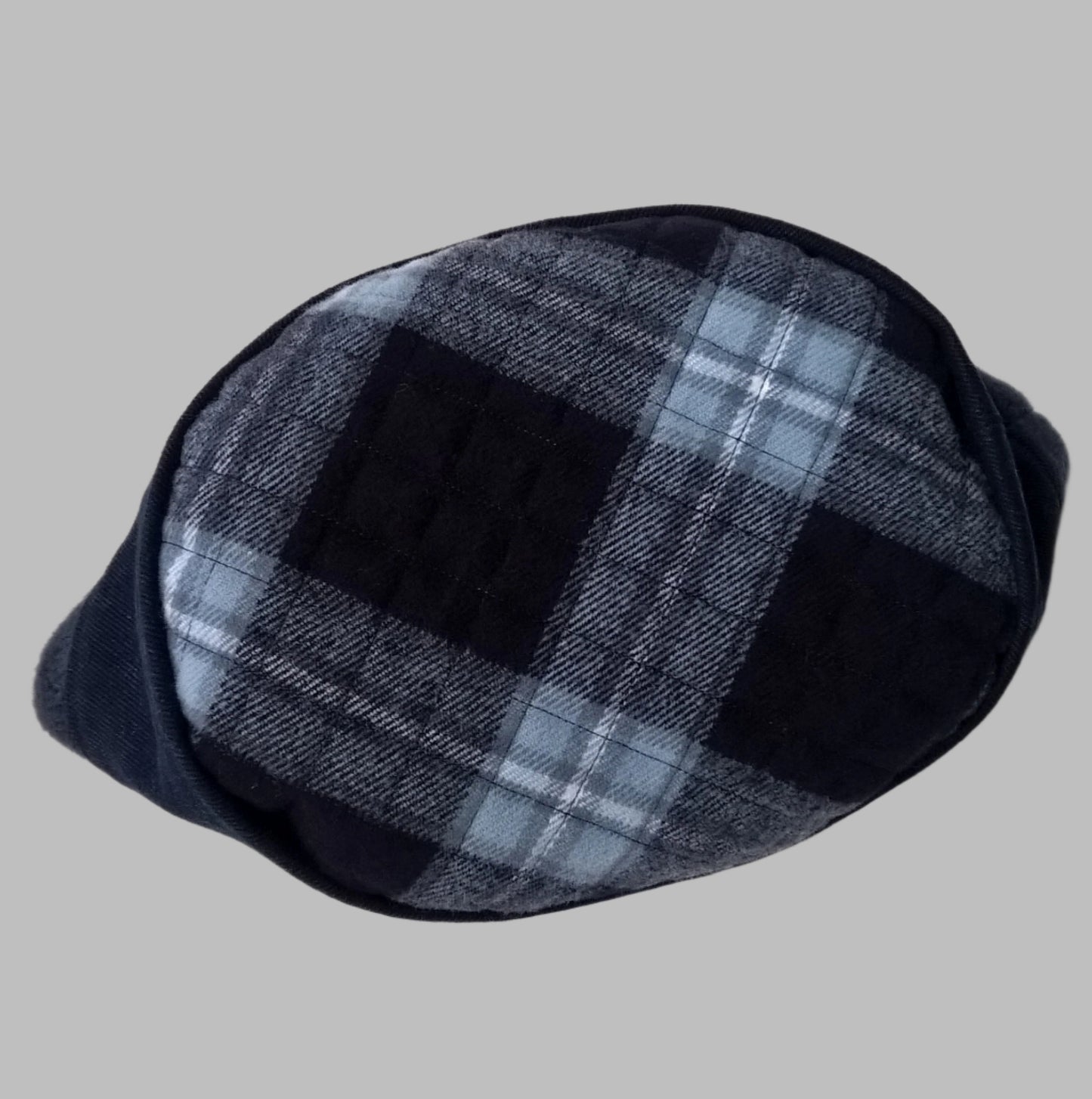 The checked tip in blue and navy is quilted to add warmth and structure to the cap. The double dyed blue indigo denim crown has a sophisticated edging of blue fleece, which compliments the multi blue check patterned tip. The fleece continues through to the inside of the hat to form the lining, along with a fleece of bright blue, for extra cosiness.