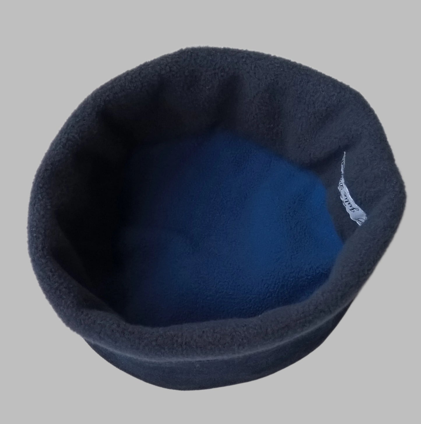 Handmade lumberjack style brimless fleece hat in shades of blue.