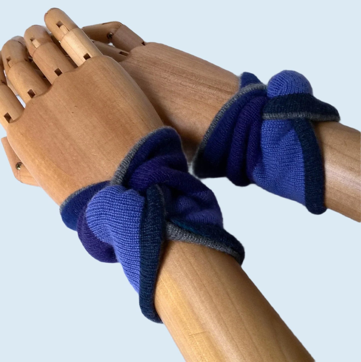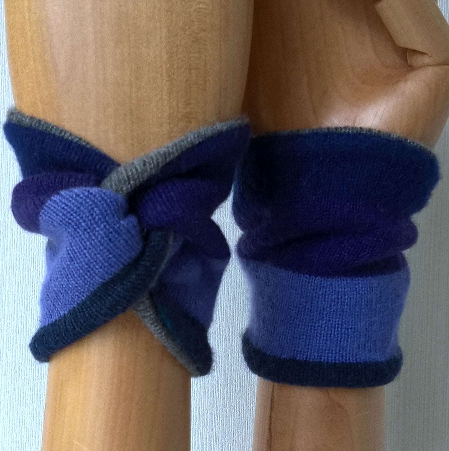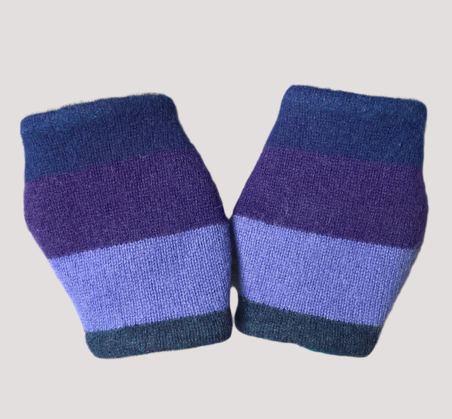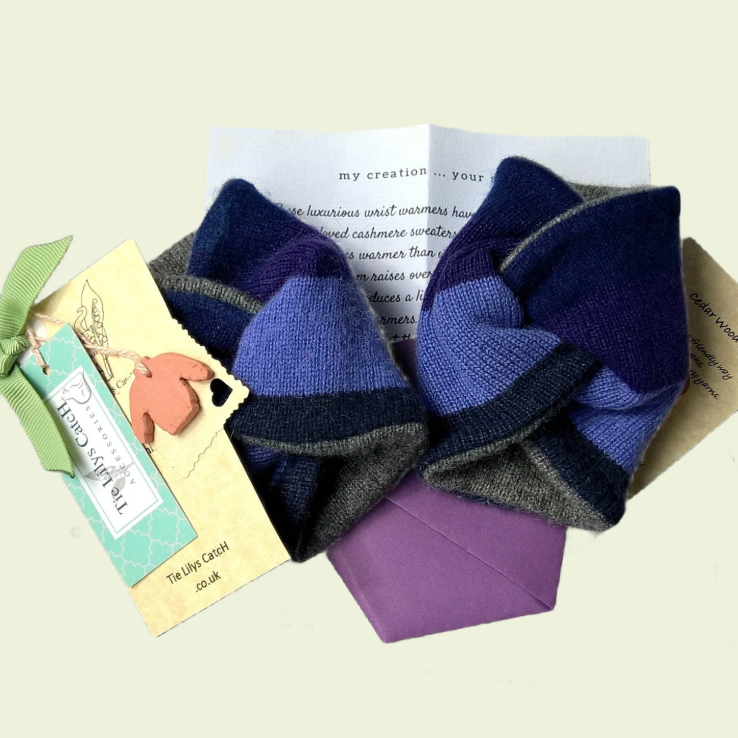 Handmade from pre-loved sweaters, in gorgeous purple and blue stripes lined with grey marl, they provide extra toasty warmth with their double layer of soft fine cashmere. The stylish knot design is snug to the wrist and the shorter style means they won't get in the way of your daily activities.