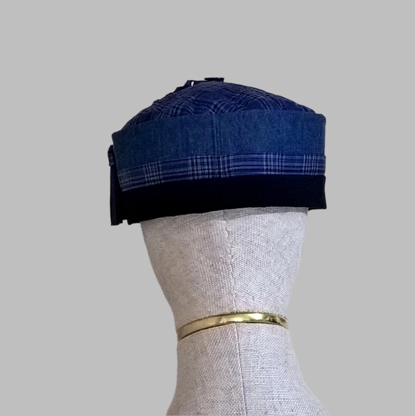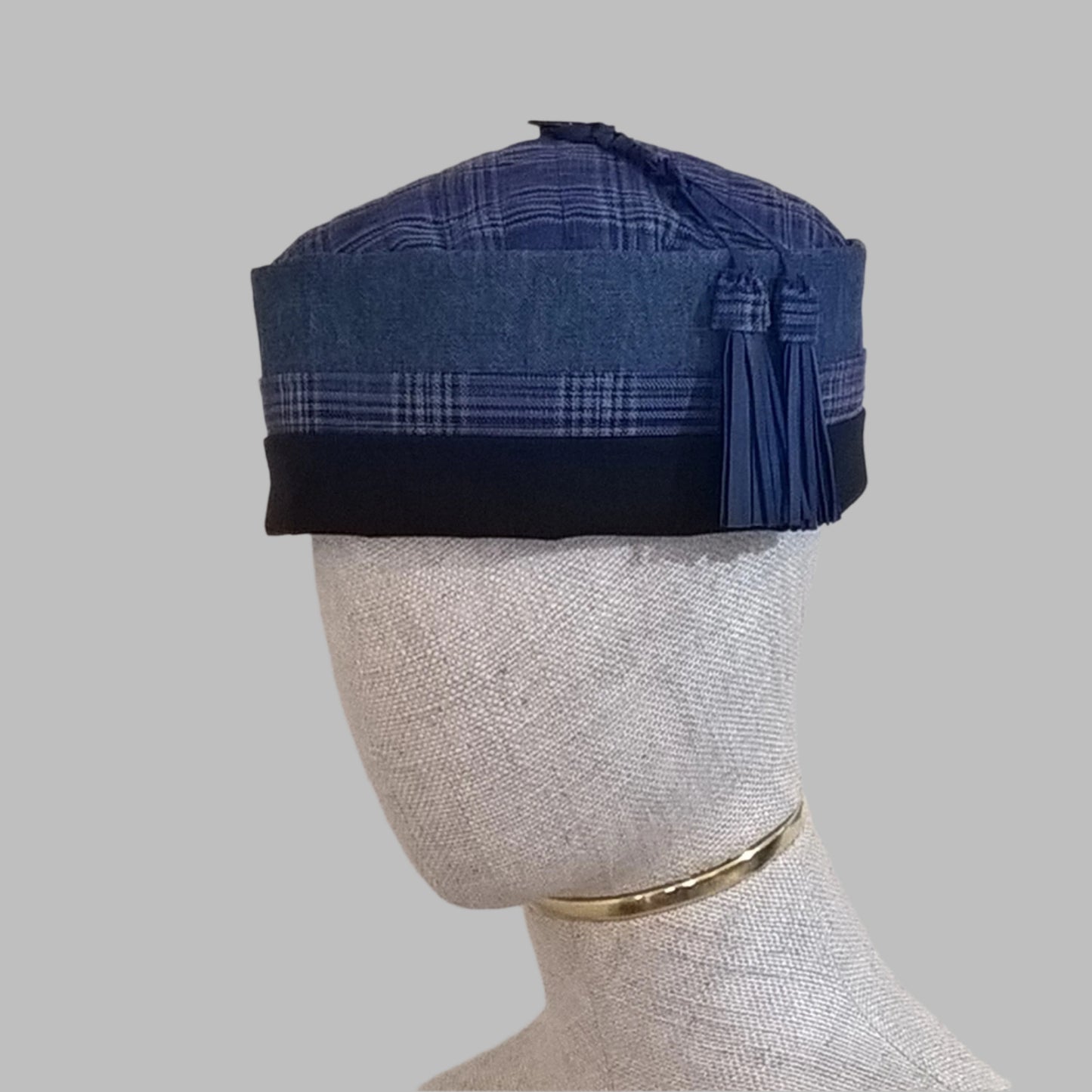 Classy colours in a classic design! A beautiful smoking cap handmade in fine wool cobalt blue check, chambray denim and navy cotton, with a cobalt blue leather tassel. Lightweight natural fabrics with breath-ability for spring-like days.