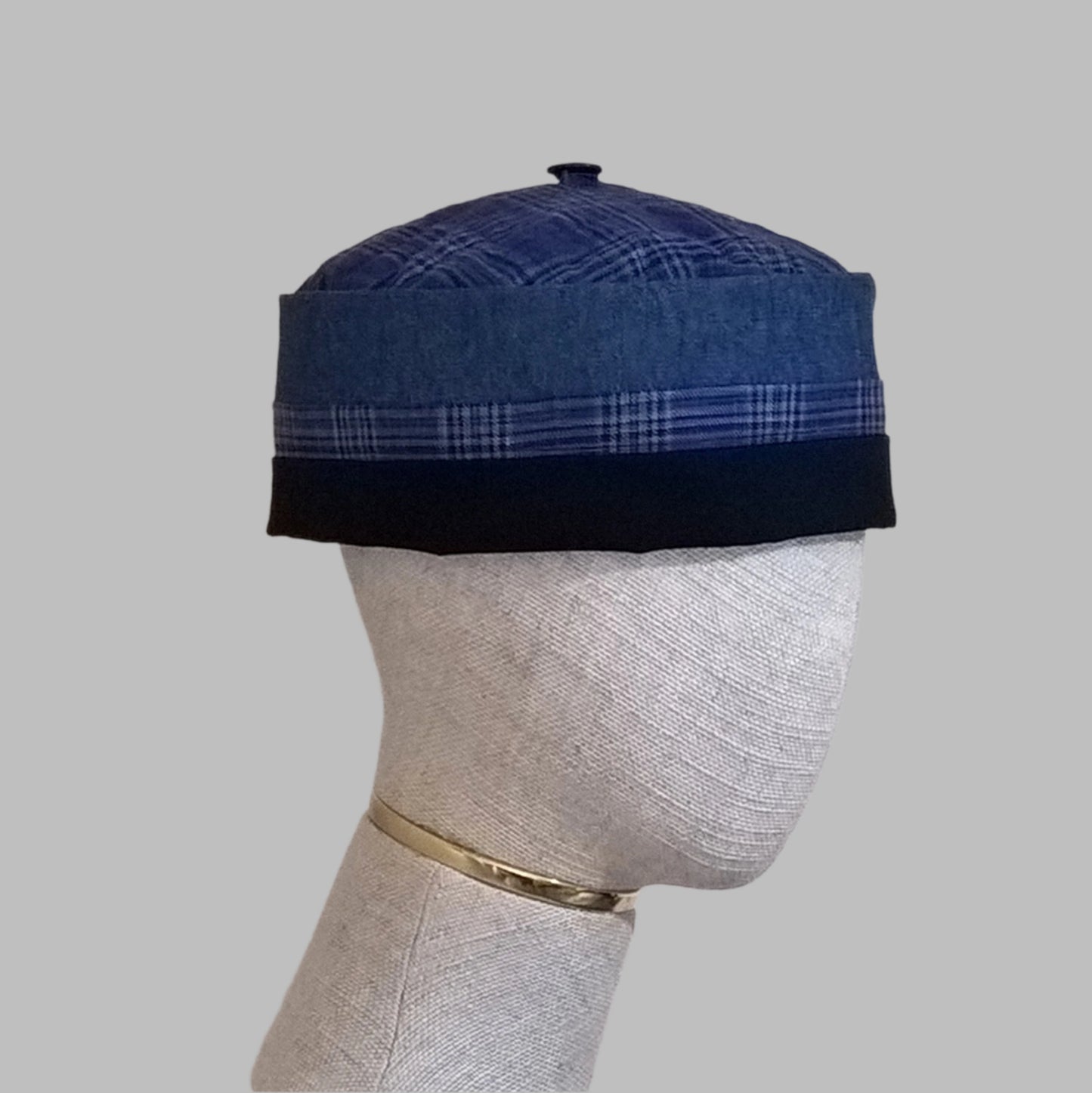 The chambray denim and navy cotton crown is trimmed with a band of the cobalt blue check wool, to tie the colours together while adding a sophisticated detail. The shade of blue chambray may vary.