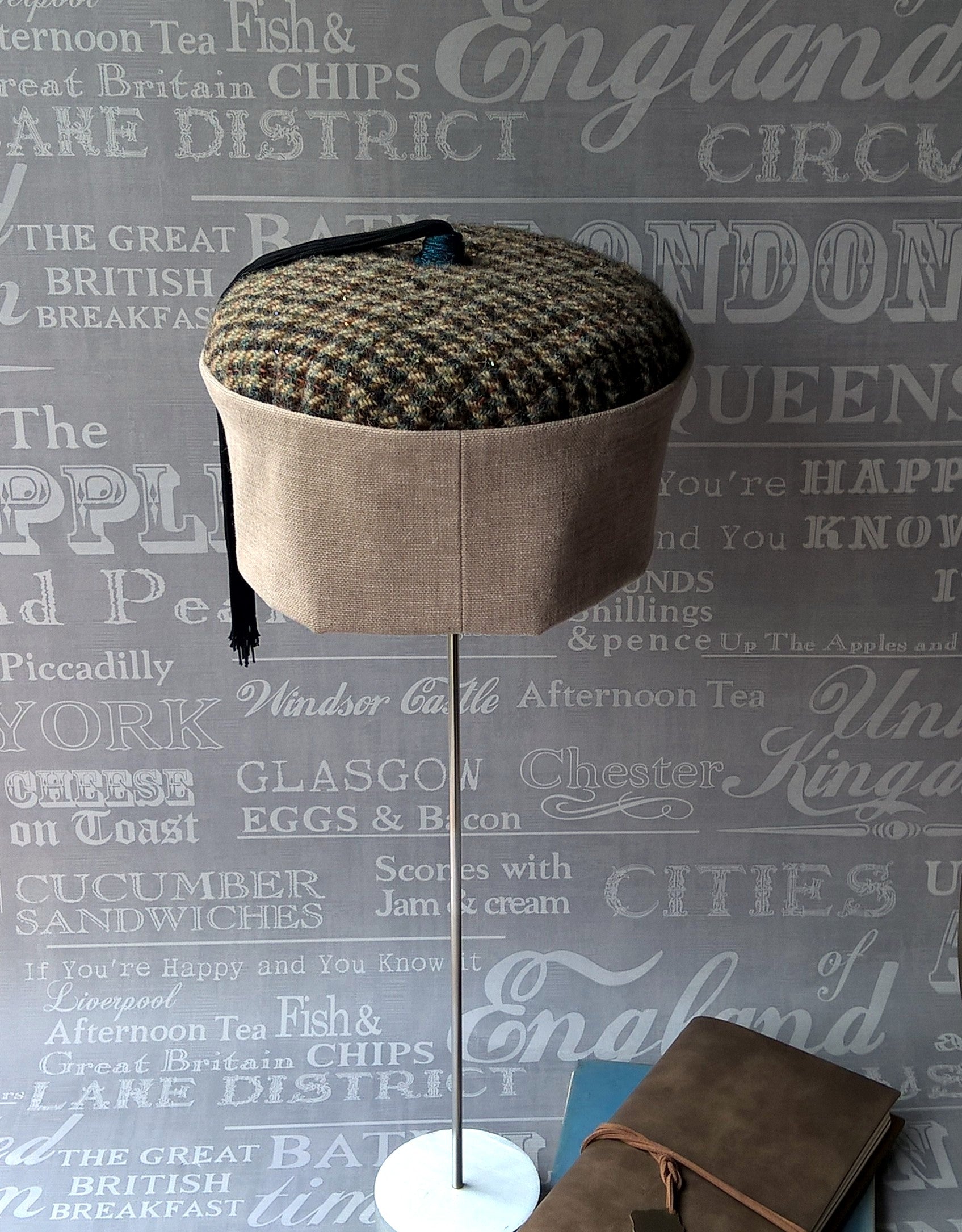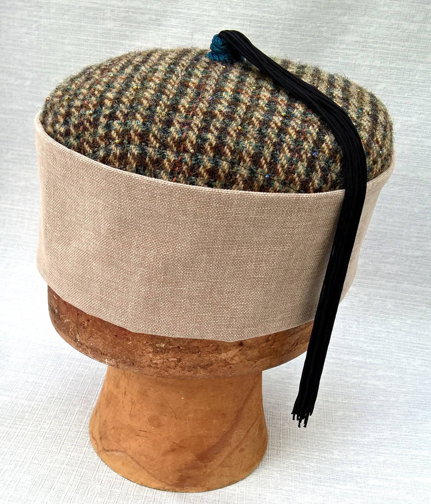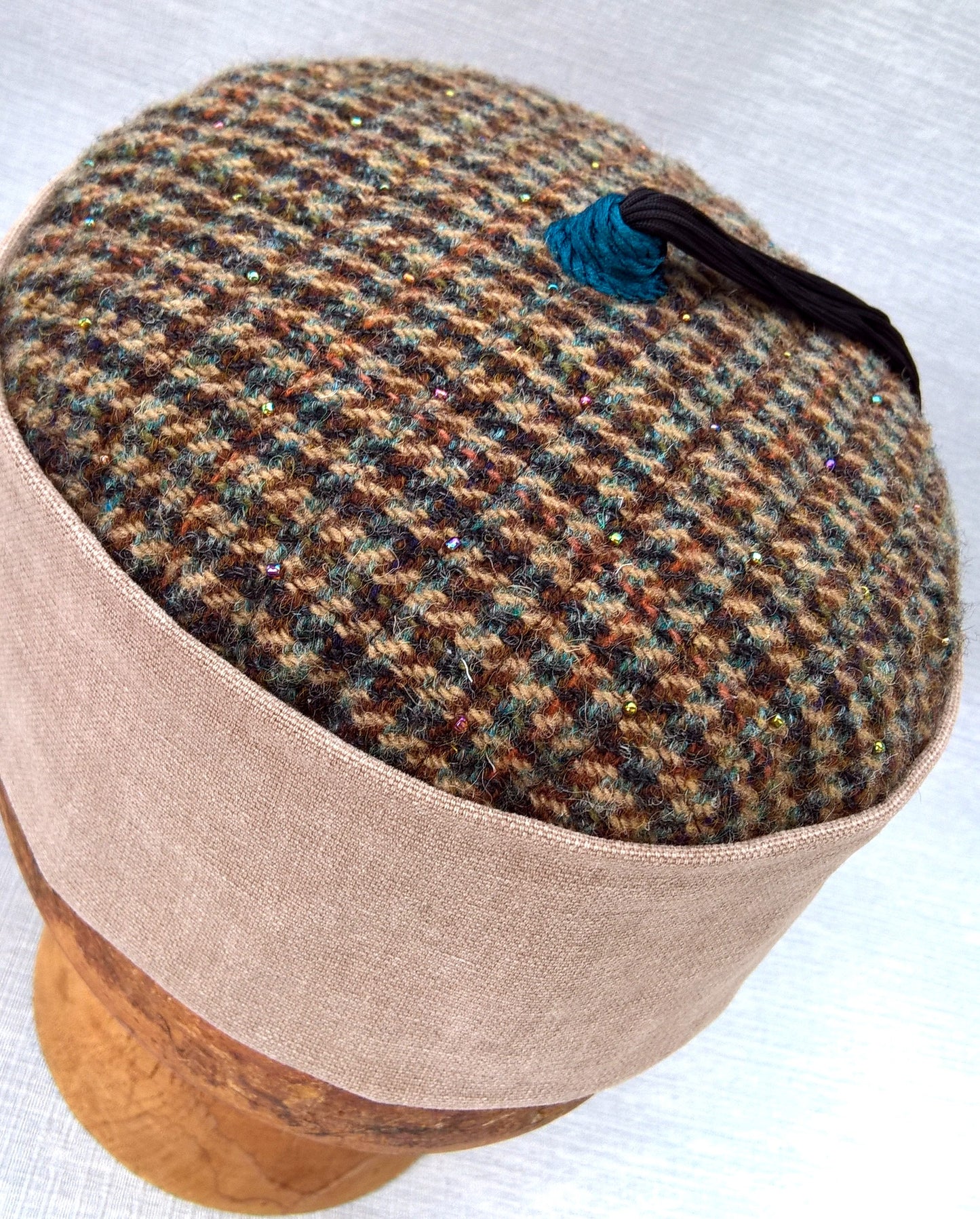 This handmade pillbox hat has a colourful Harris Tweed wool tip, with browns, fawn, blues and orange, quilted and hand embellished with multi coloured seed beads. A natural fibre fabric (composition unknown) in dark beige is used for the crown. It has a peach finish giving it a luxuriously tactile softness. The tassel is stylish and handcrafted from vintage black fringing, finished with a vibrantly bold blue cord.