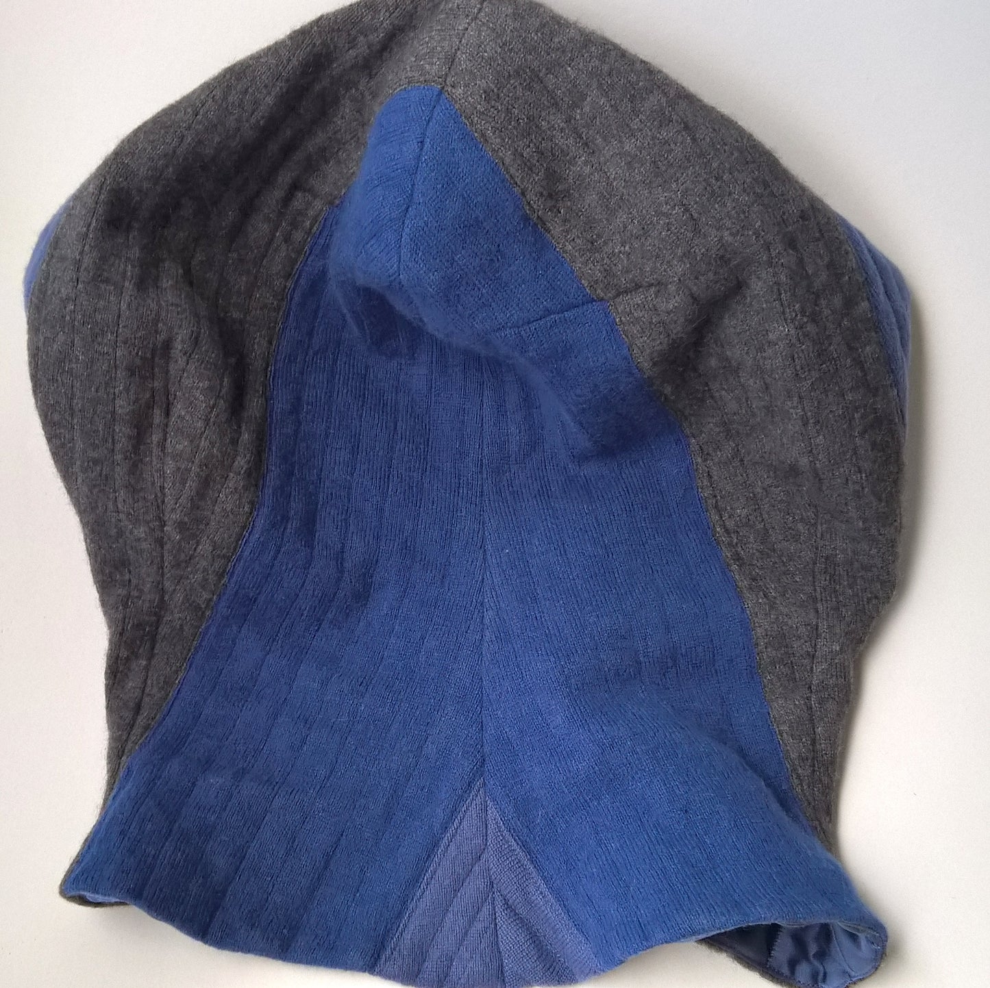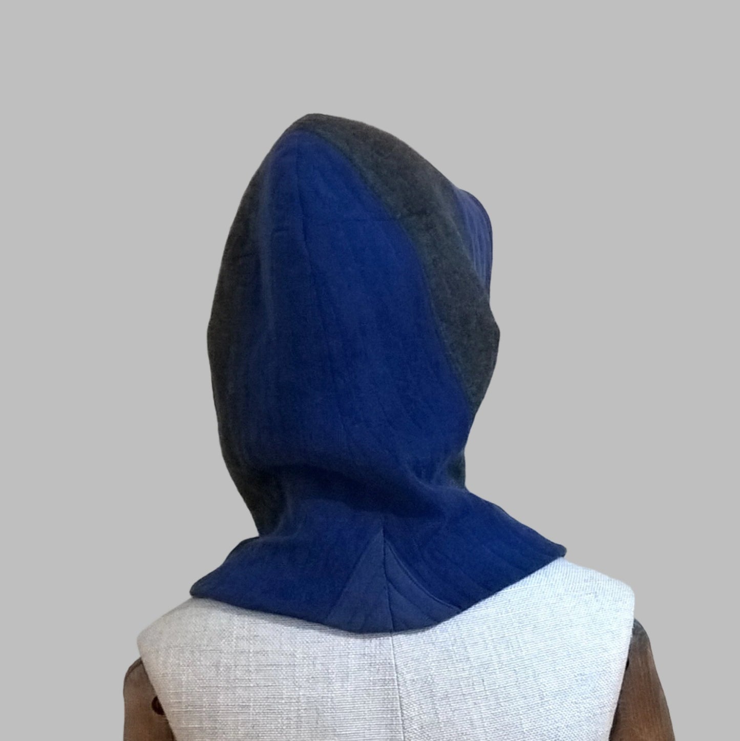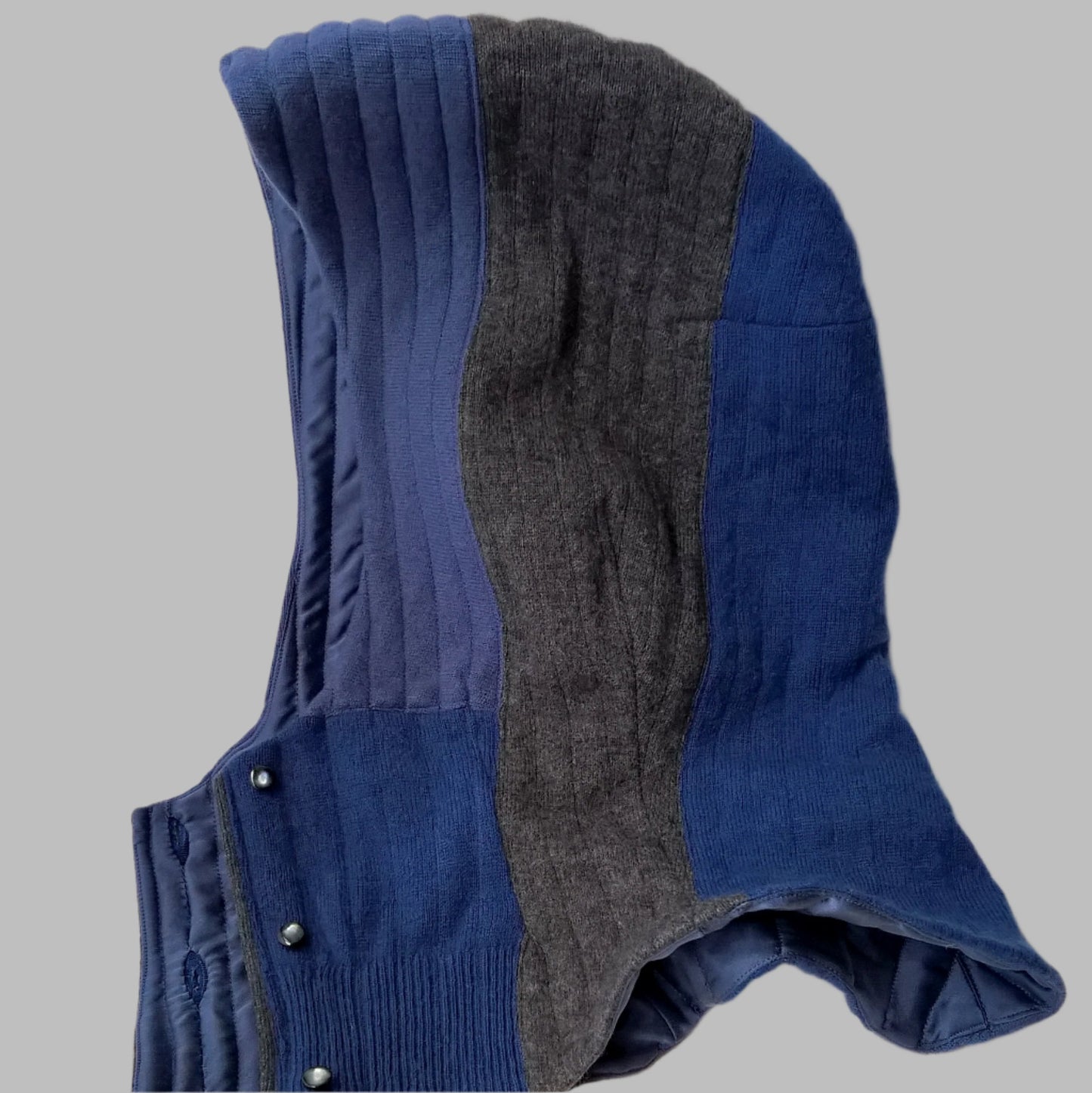The hood is handmade from up-cycled pure cashmere sweaters of blues and charcoal grey, which are patch-worked and quilted to soft cotton winceyette with vertical and diagonal lines. This form of quilting is called flat quilting, the purpose of which is to add that extra layer of warmth.