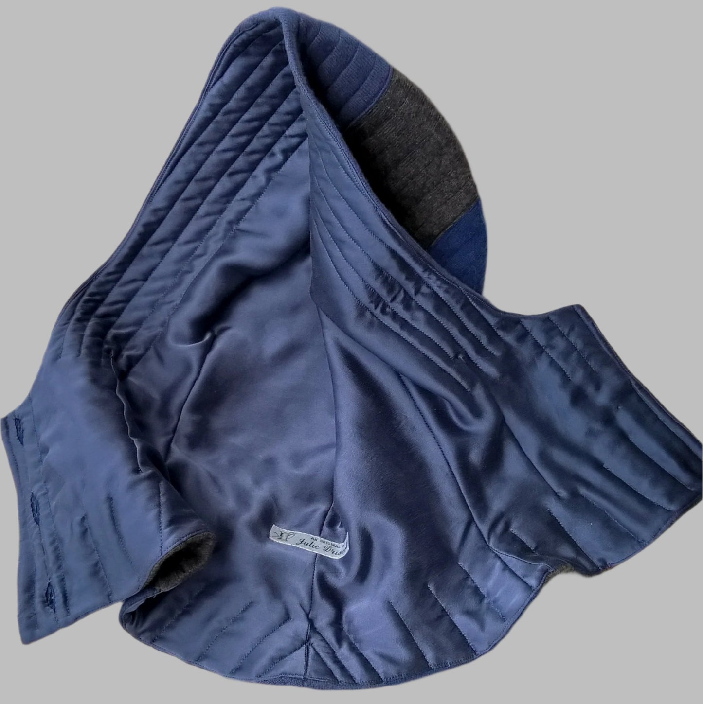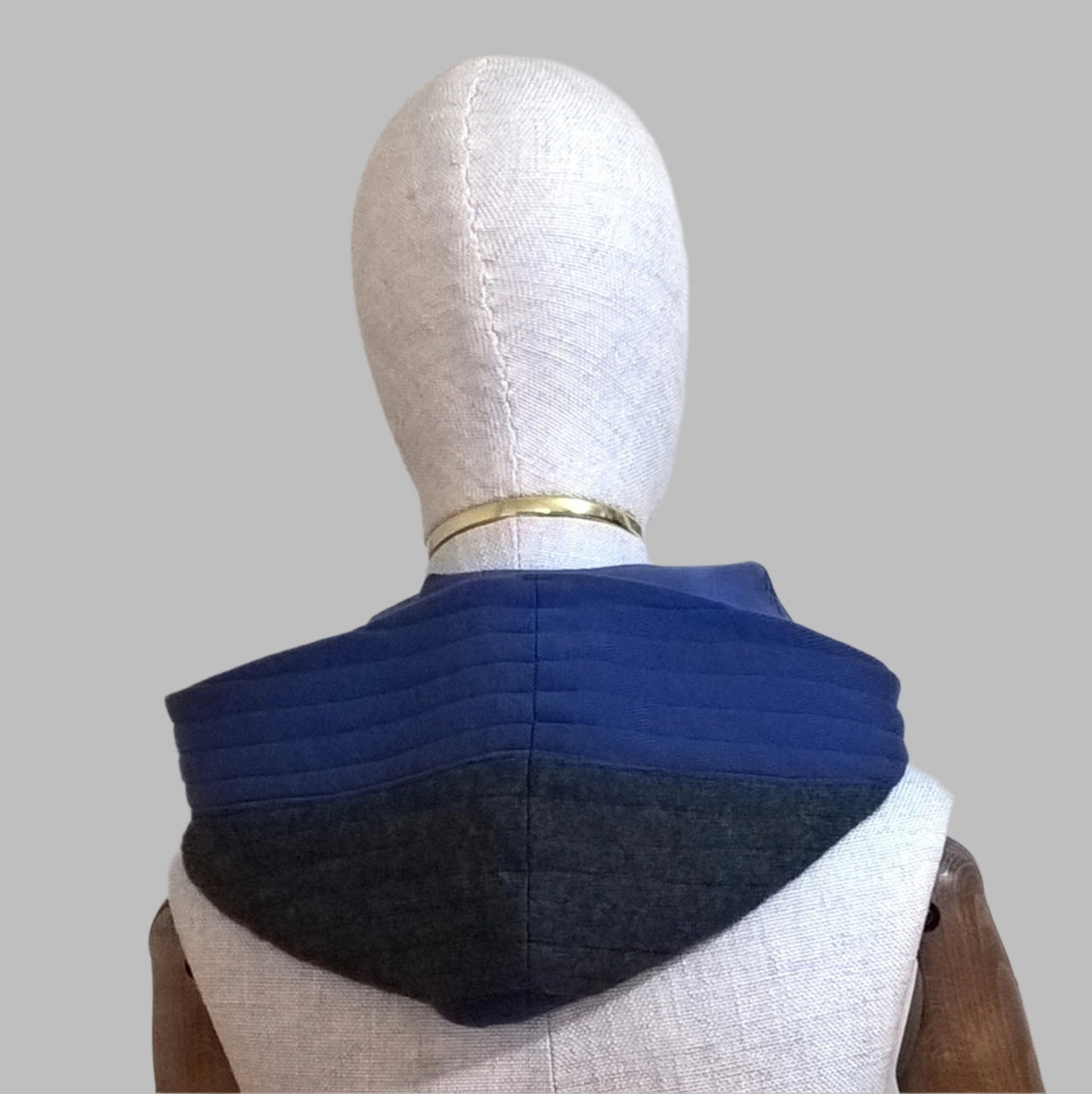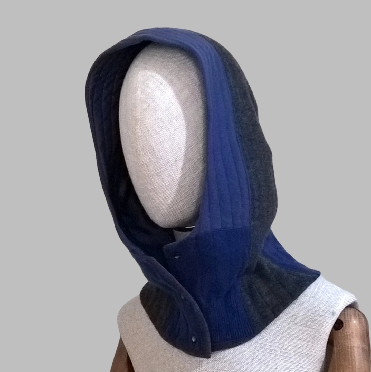 The hood is handmade from up-cycled pure cashmere sweaters of blues and charcoal grey, which are patch-worked and quilted to soft cotton winceyette with vertical and diagonal lines. This form of quilting is called flat quilting, the purpose of which is to add that extra layer of warmth.