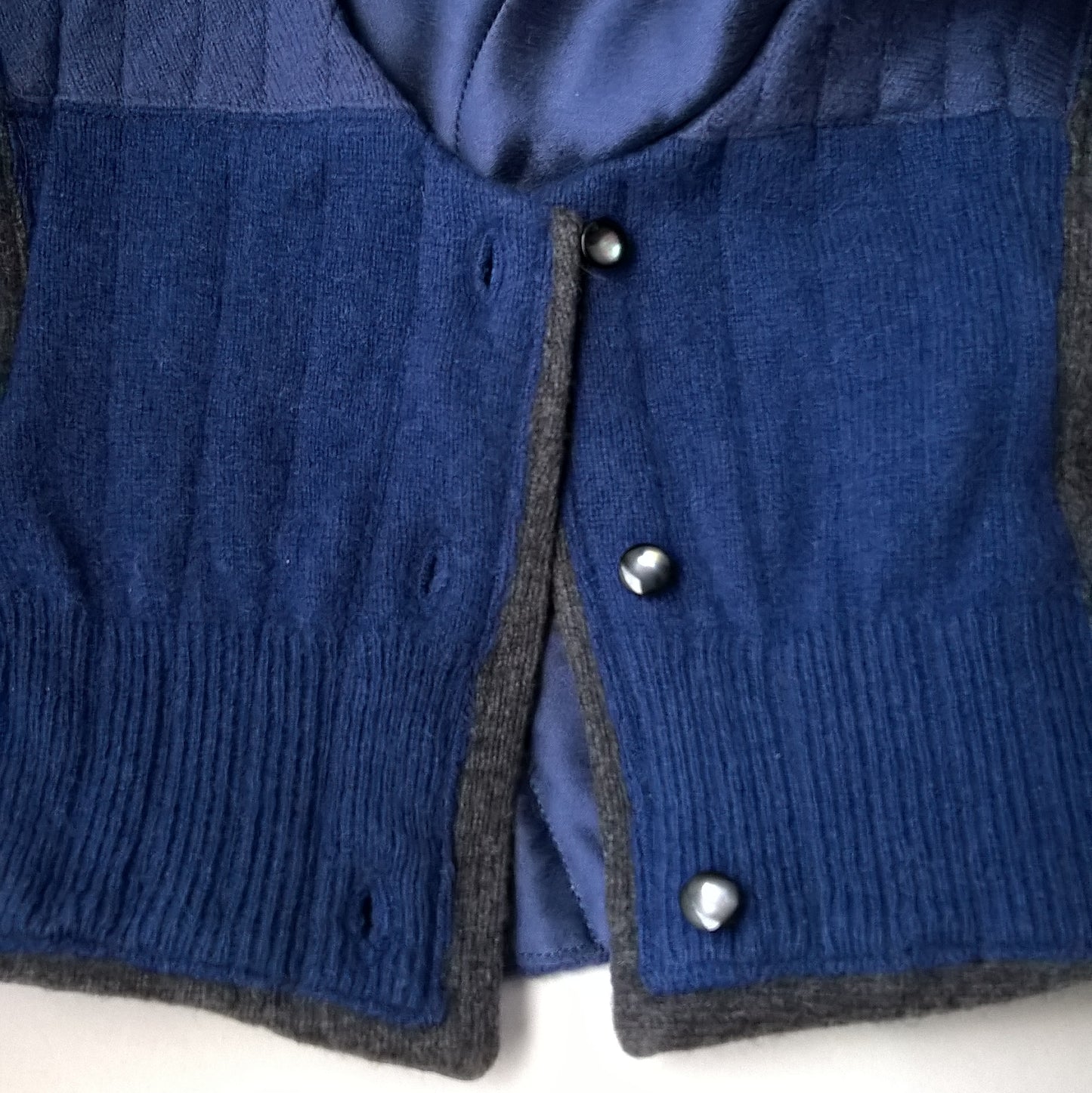 A blue lining of beautiful soft sandwash silk is added which is part quilted to the cashmere. The front edges of a cardigan provide extra detail at the neck, with the original button holes and three vintage diminutive buttons forming the closure.
