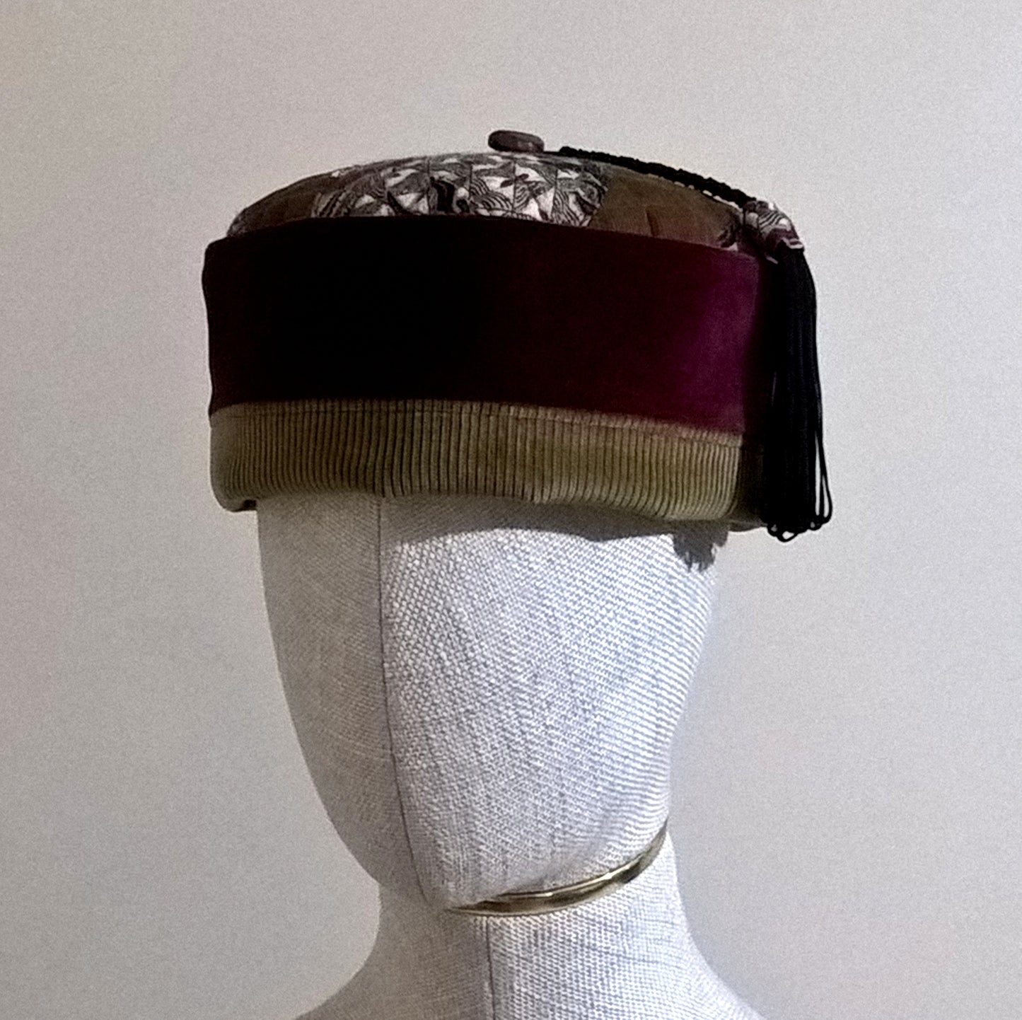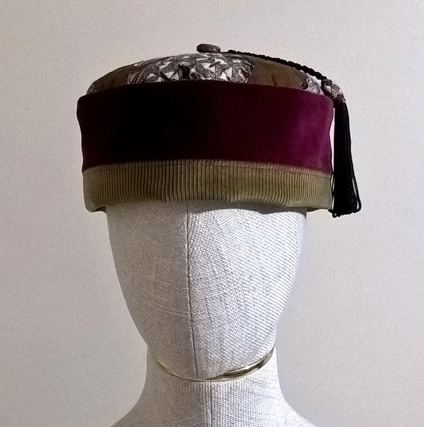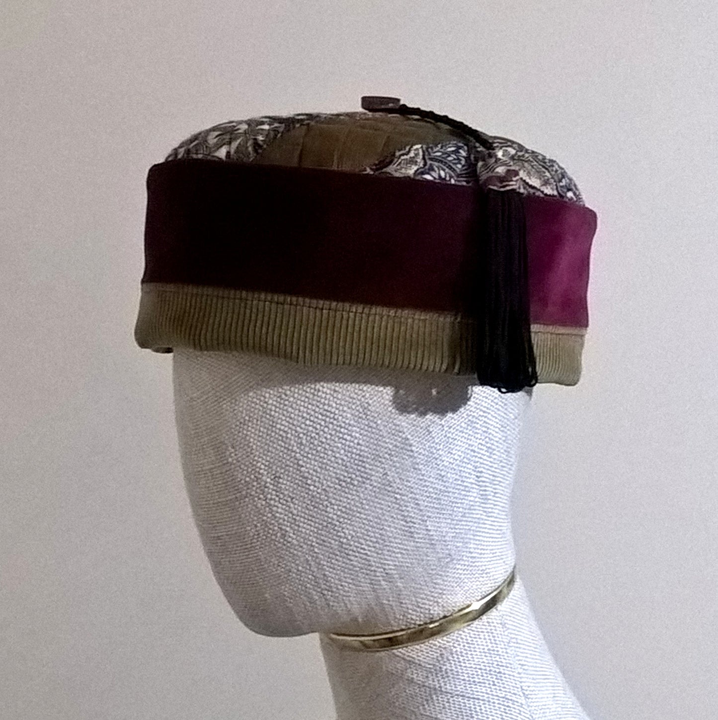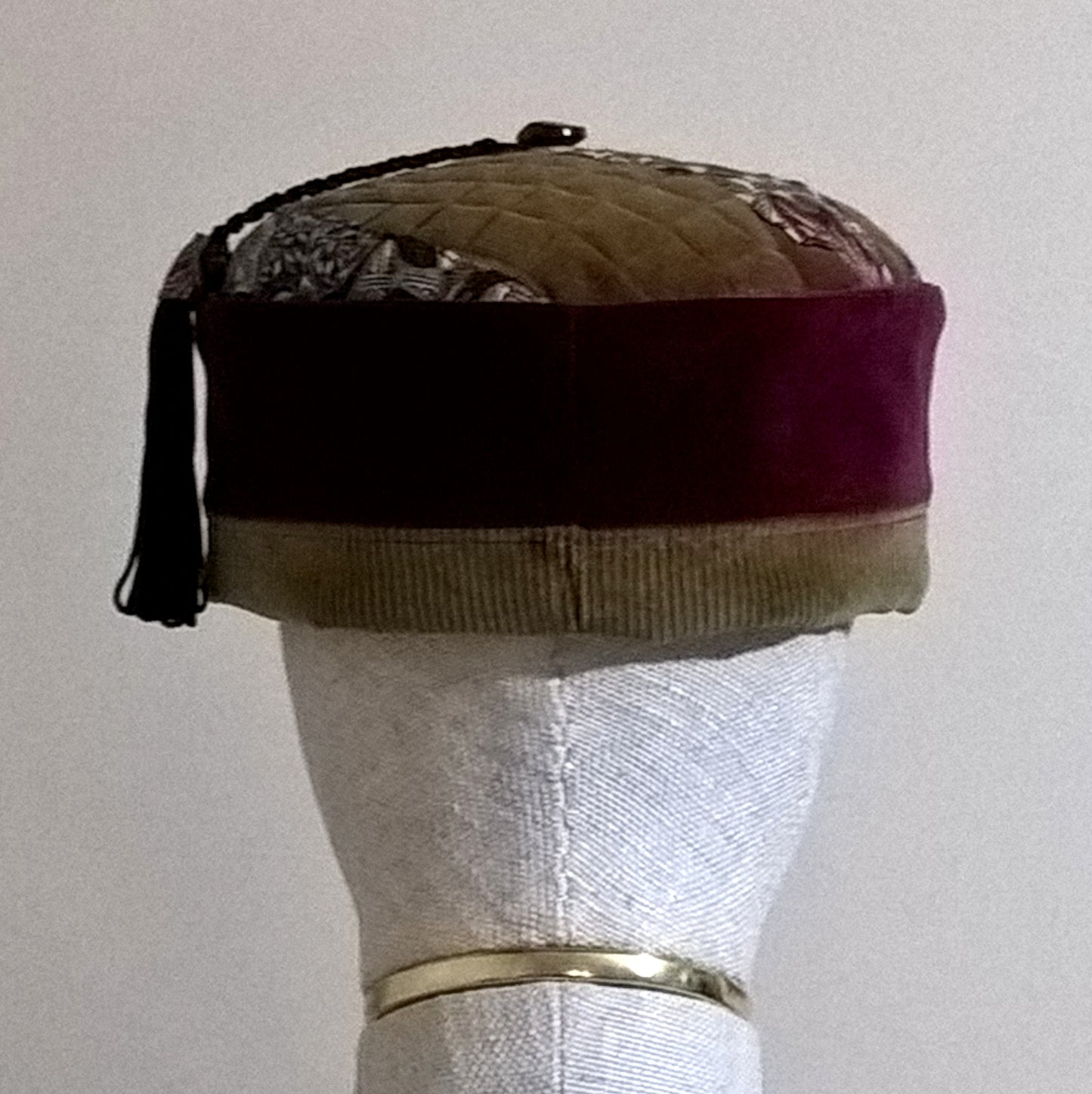 An elegant cap based on the eastern looking lounge hat or fez of the 1860's/70's. The perfect gentleman's dress hat, wizard or magician's hat.