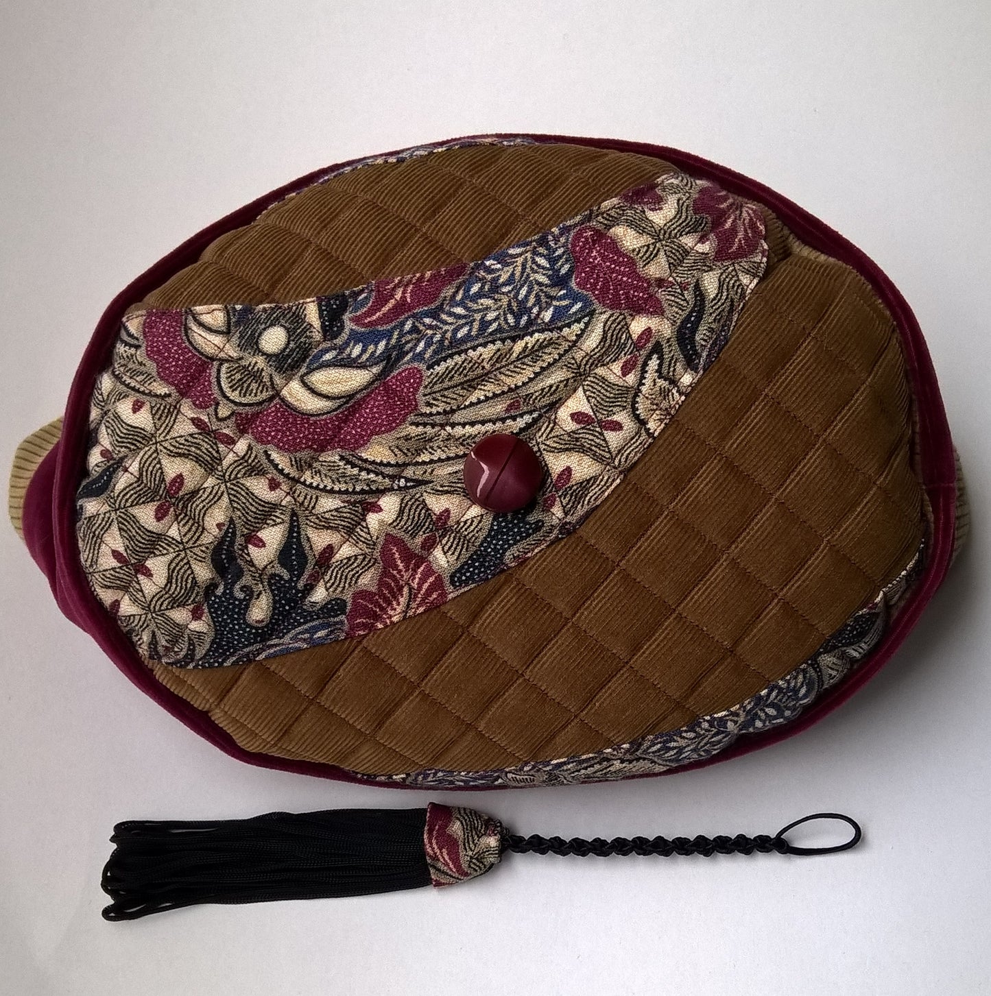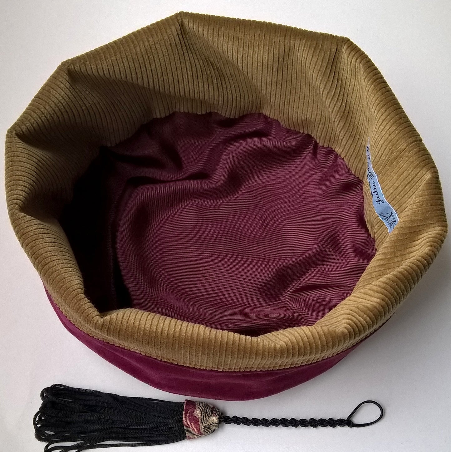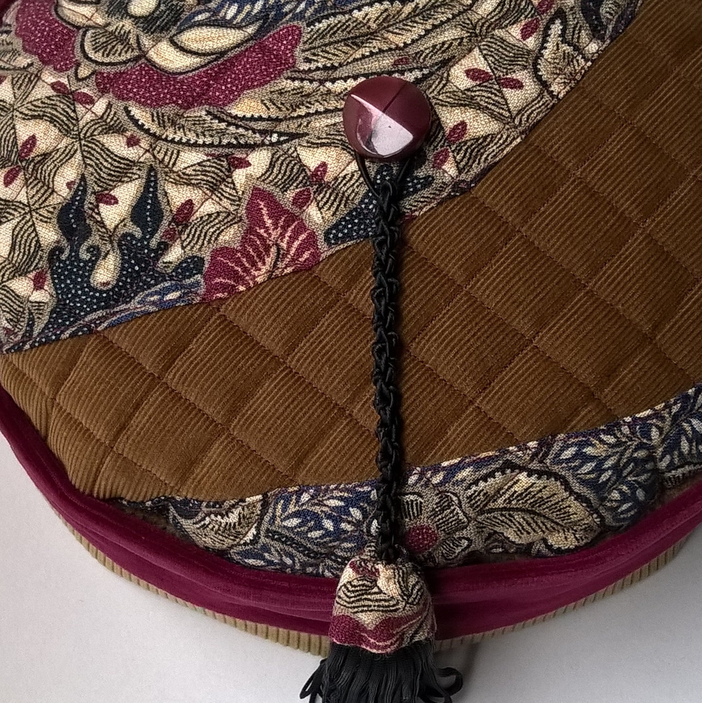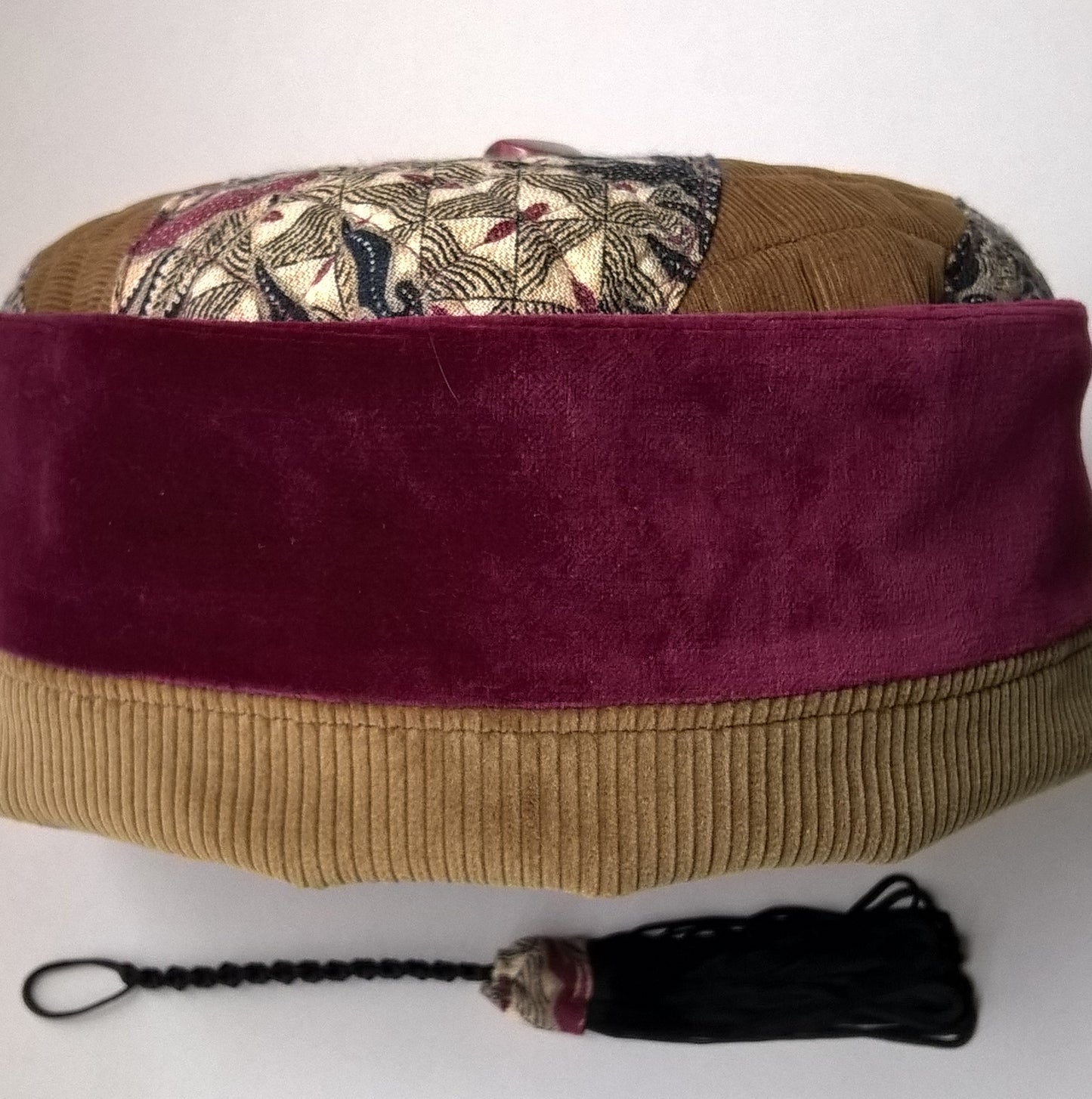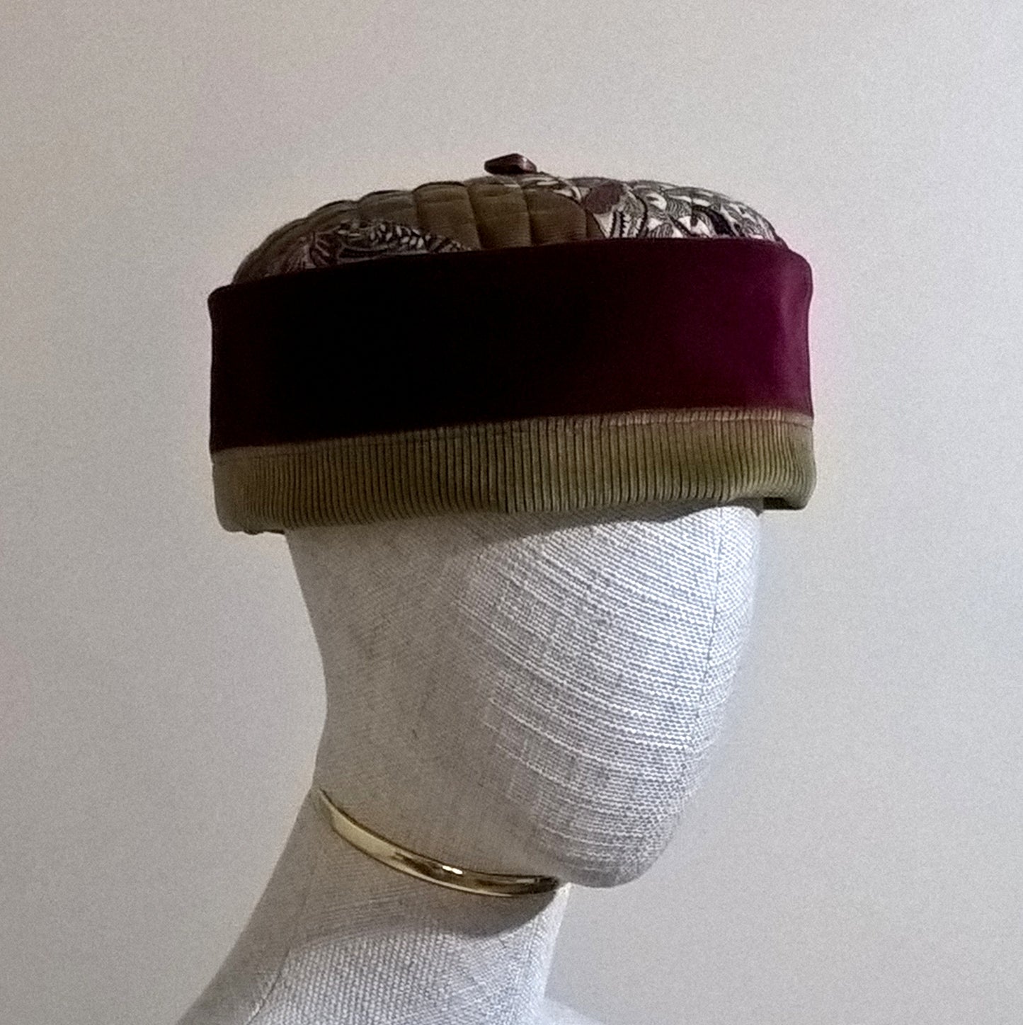 This handmade hat has a distinctive quilted tip of brown corduroy and paisley applique, using vintage fabric off cuts. A deep band of luscious vintage burgundy cotton velvet on the crown is highlighted by a band of olive brown cotton corduroy. The corduroy carries through to the inside of the hat to form part of the lining along with burgundy satin.
