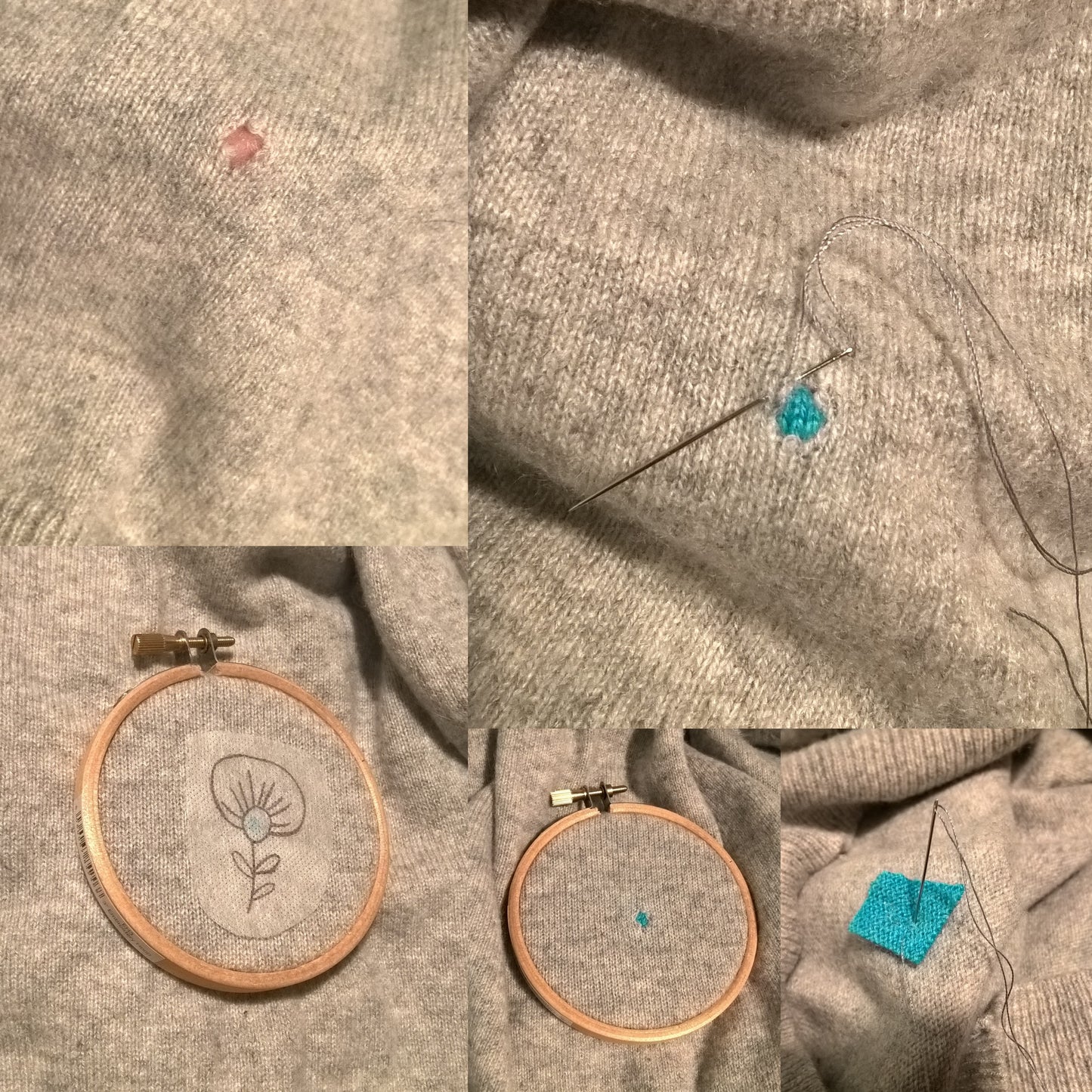 A hole could be patched with a swatch of pure cashmere, or with Bondaweb shapes cut from the cashmere to be used to form an applique design, and finished with a little embroidery. Use a stick and stitch patch to add an embroidery design or perhaps needle felting, or even a combination of the two.